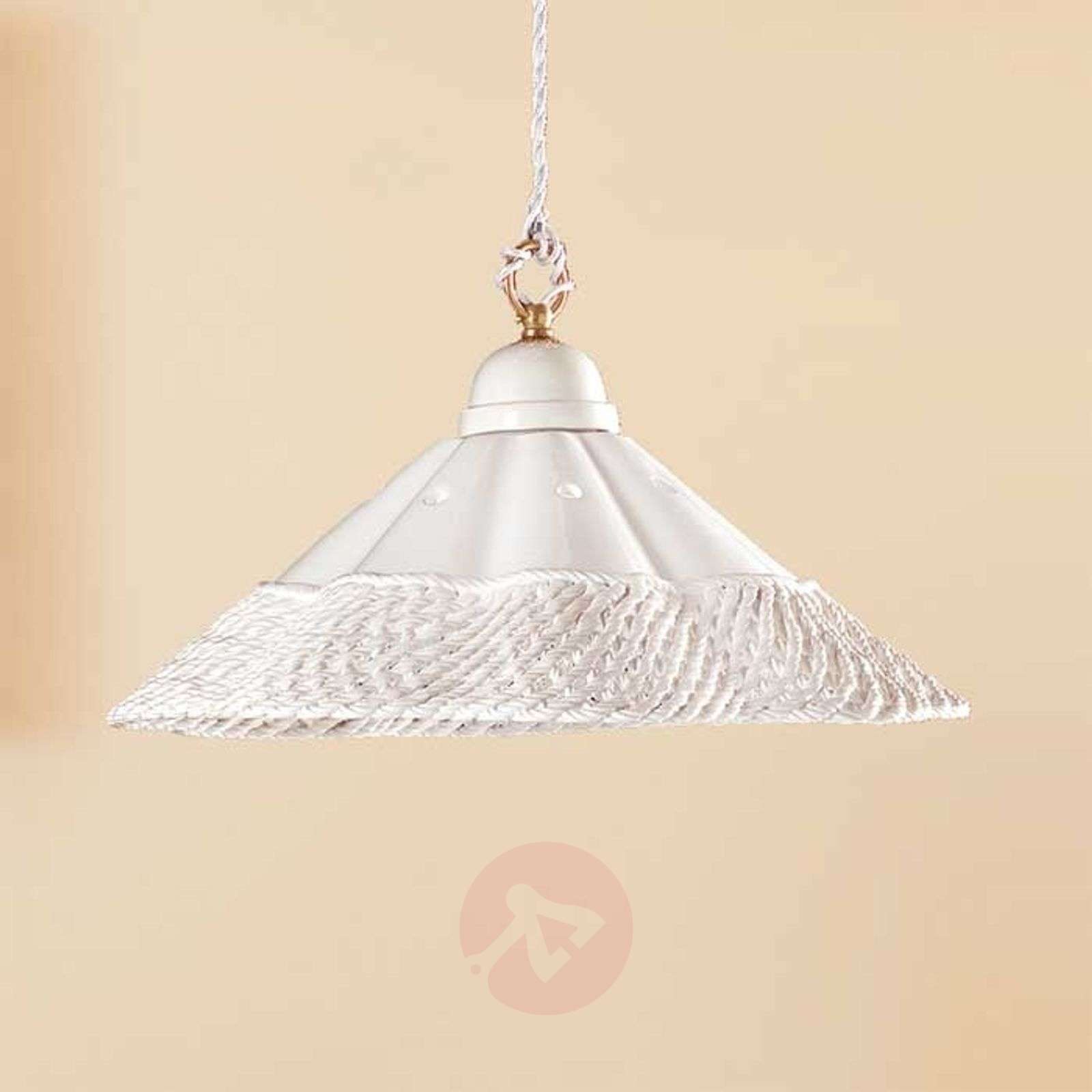 Czarująca lampa wisząca z ceramiki - GONNELLA Ta czarująca lampa wisząca ubogaci pomieszczenia urządzone w stylu romantycznym. Ma biało glazurowany klosz ceramiczny, którego powierzchnia ozdobiona została dekoracyjnym wzorkiem z otworami. Stylistyką przypomina on falującą, koronkową spódnicę i wpisuje się pięknie w romantycznie zaaranżowane wnętrza. Strumień światła lampy, odbijając się od glazurowanej powierzchni klosza pada bezpośrednio w dół. Klasa efektywności energetycznej: A++