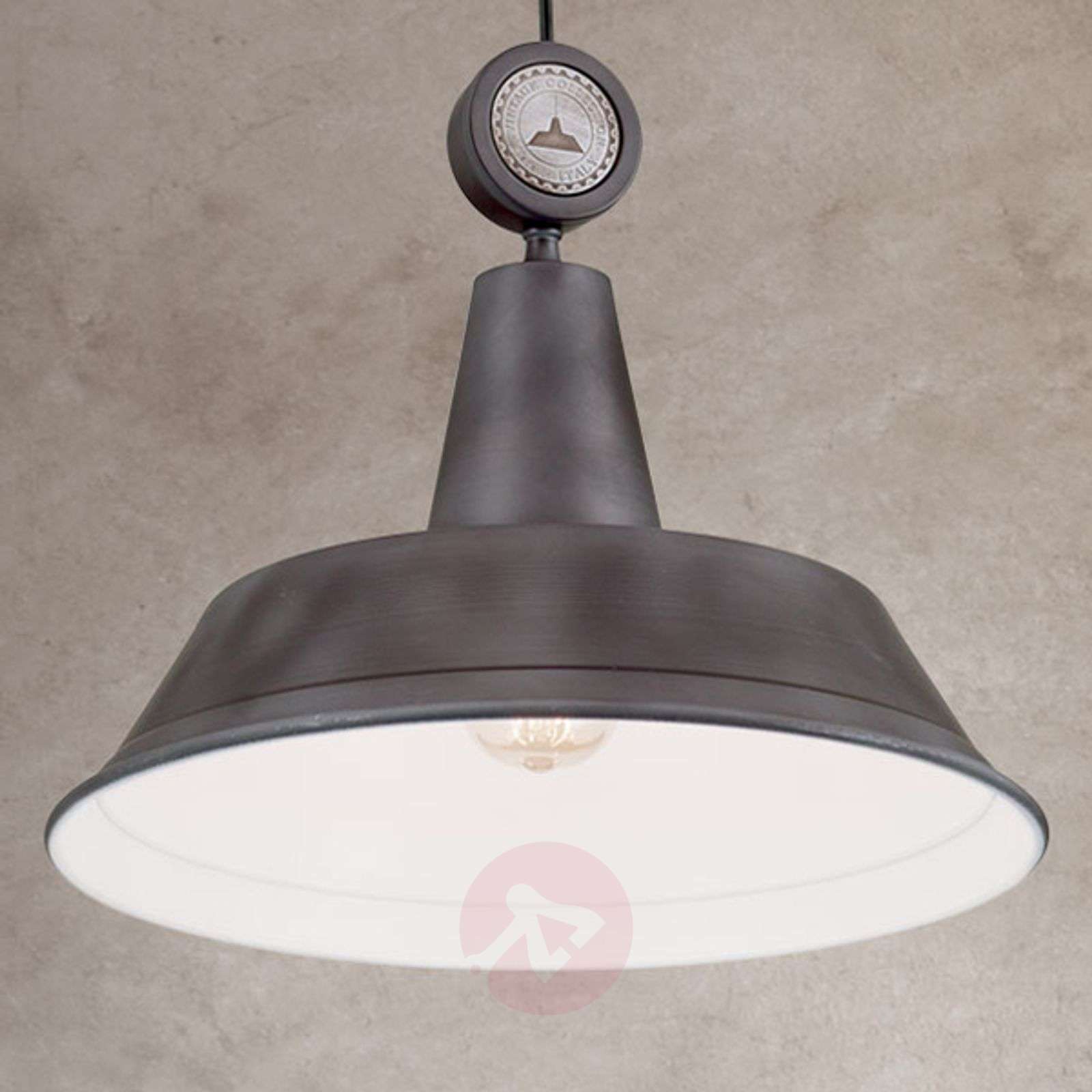 Utrzymana w kolorystyce antycznej szarości lampa wisząca Istari w stylu vintage Metalowy klosz lampy wiszącej Istari od wewnątrz pokryty jest białym lakierem, który intensyfikuje reflektowanie światła. Jej zewnętrzna powierzchnia w kolorze antycznej szarości wprowadza do pomieszczenia powiew vintage, który podkreślany jest jeszcze mocniej wytłoczonym metalowym emblematem na górnym zakończeniu klosza. Czarny kabel można dowolnie skrócić w trakcie montażu. Rustykalny urok lampy wiszącej Istari będzie dobrze pasował zarówno do wiejskich rezydencji, jak również do nowoczesnych wnętrz utrzymanych w stylu vintage. Zaleca się użycie źródła vintage, które podkreśli wiodącą stylistykę lampy. Klasa efektywności energetycznej: A++