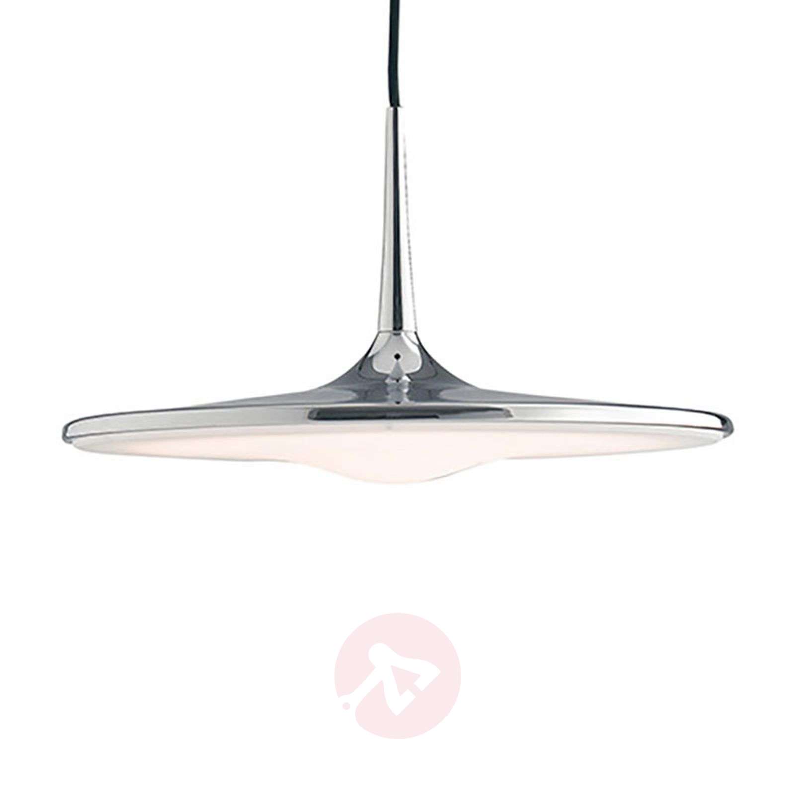 Elegancka, nie narzucająca się lampa wisząca LED Ikon Jak sama nazwa wskazuje, chromowana lampa wisząca LED Ikon ma to, czego potrzeba, aby stać się prawdziwą ikoną stylu. Okrągła, zbiegająca się w szpic rozeta sufitowa podtrzymuje klosz na czarnym kablu. Klosz lampy LED ma kształt płaskiej, wystającej karuzeli, która bez przeszkód utrzymuje równowagę. Płaski, biały opalowy dyfuzor zajmuje całą dolną część klosza i rozprasza światło diod LED umieszczonych w środku. Niepozorne wzornictwo jest ponadczasowe i równie eleganckie. Lśniąca chromowana powierzchnia pasuje do wielu stylów wyposażenia wnętrz i jest dyskretna. Klasa efektywności energetycznej: A+