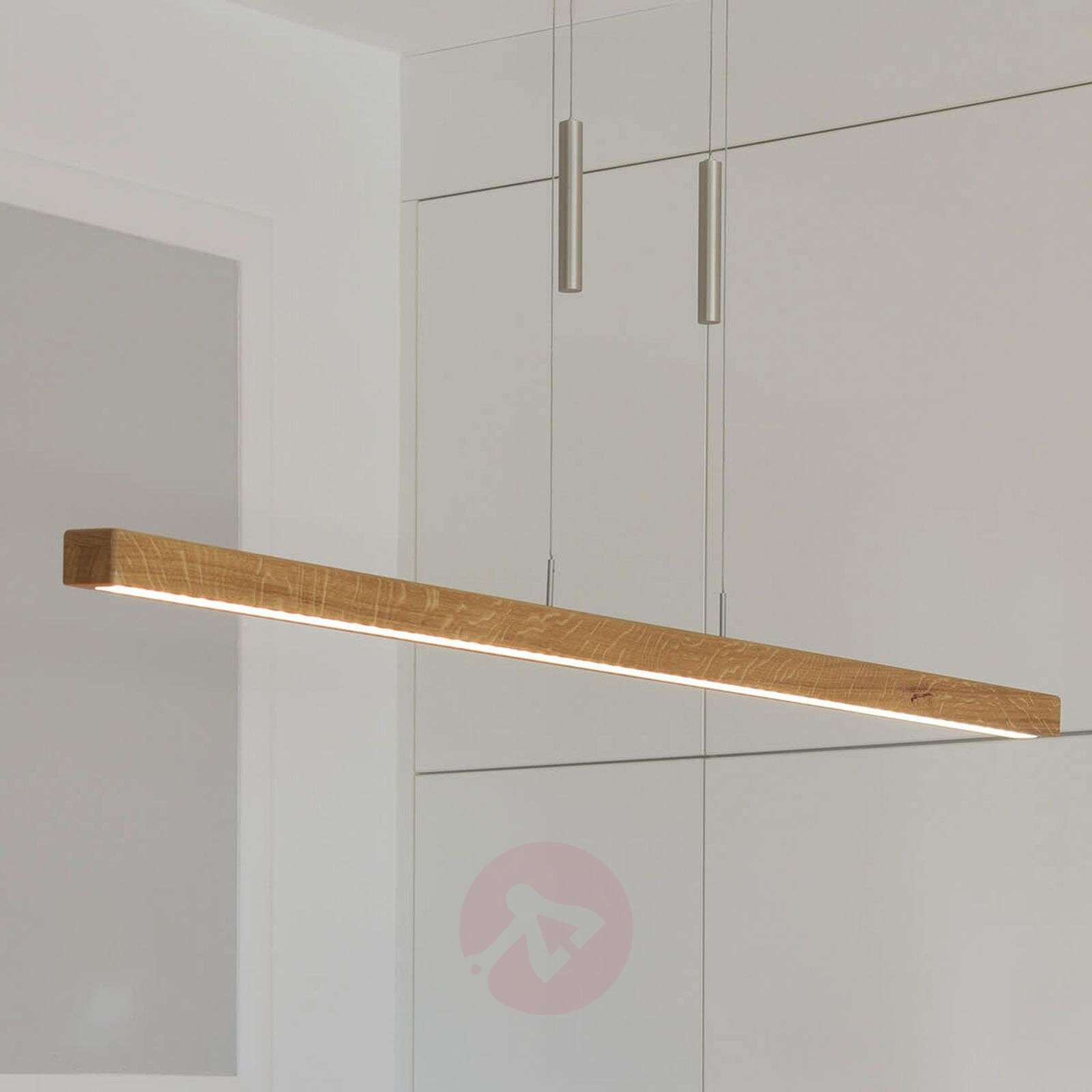 Lampa wisząca z litego drewna Leonora o regulowanej wysokości, ze ściemniaczem dotykowym Leonora to lampa wisząca LED, która wygląda bardzo elegancko, gdy powiesimy ją nad wydłużonym stołem w jadalni, a przy tym zapewnia niezwykle jasne oświetlenie powierzchni. Jako że korpus jest starannie wykonany z litego drewna dębowego, stanowi wystarczający powód, aby zapewnić mu centralne miejsce w domu, gdzie można będzie perfekcyjnie podkreślić jego niezwykły design. Leonora cechuje się nie tylko pięknym wyglądem. Proponuje bowiem również innowacyjne rozwiązania techniczne. U góry na belce znajduje się ściemniacz dotykowy z czujnikiem, niewidoczny od zewnątrz. Można go używać do ustawiania jasności tej lampy wiszącej w zależności od potrzeb. Funkcja dimm-to-warm zapewnia dodatkową porcję przytulności, a tym samym barwa światła również staje się cieplejsza w miarę procesu ściemniania. Leonora zapewnia odpowiednie oświetlenie w każdej sytuacji. Płynnie działający mechanizm linkowy umożliwia łatwą i bezstopniową regulację wysokości lampy w zakresie od 120 do 180 m. Wykonano w Niemczech! Klasa efektywności energetycznej: A+
