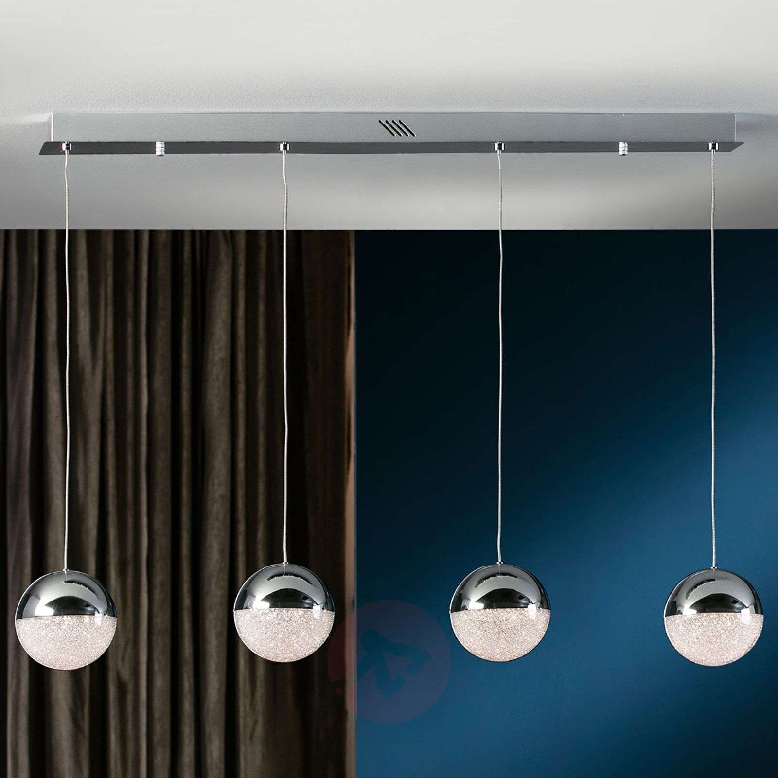 Elegancka lampa wisząca LED do akcentów świetlnych przy stole w jadalni Przy stole powstaje przyjemna i efektowna atmosfera oświetleniowa, gdy lampa wisząca LED Sphere świeci z góry. Zainstalowane na stałe diody LED oświetlają strukturę przezroczystej połówki kuli od wewnątrz i stylowo podkreślają stół w jadalni. Górna połowa kuli jest wykonana z metalu i ma chromowane wykończenie. Ten blask jest również odzwierciedlony w rozecie sufitowej w kształcie belki, z której zwisają cztery zawieszenia i kule. Ta lampa jest imponująca i energooszczędna. - ściemnianie tylko przy użyciu ściemniacza 0-10 V lub PWM Klasa efektywności energetycznej: A+