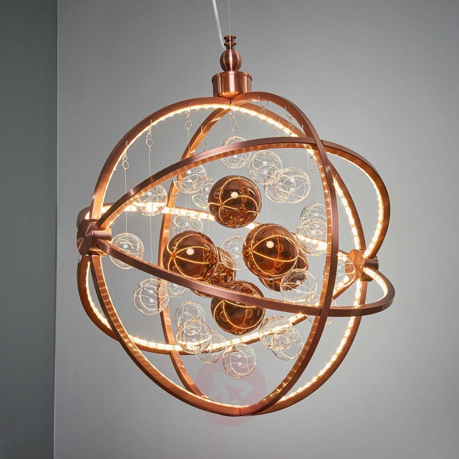 Futurystyczna lampa wisząca LED Universum o charakterze designerskim Sama nazwa lampy wiszącej Universum mówi już wiele o jej wyglądzie: Oprawa ta zaprojektowana jest jak wszechświat, w którym wiele planet wiruje i porusza się po orbicie. W środku na różnych wysokościach zawieszone są przezroczyste szklane kule o barwie miedzi, mające różną wielkość. Są one podświetlane diodami LED, znajdującymi się w rozpórkach kulistej podstawy, która wygląda jak model orbit. Kule częściowo odbijają światło i powodują powstanie pięknych refleksów. Klasa efektywności energetycznej: A+