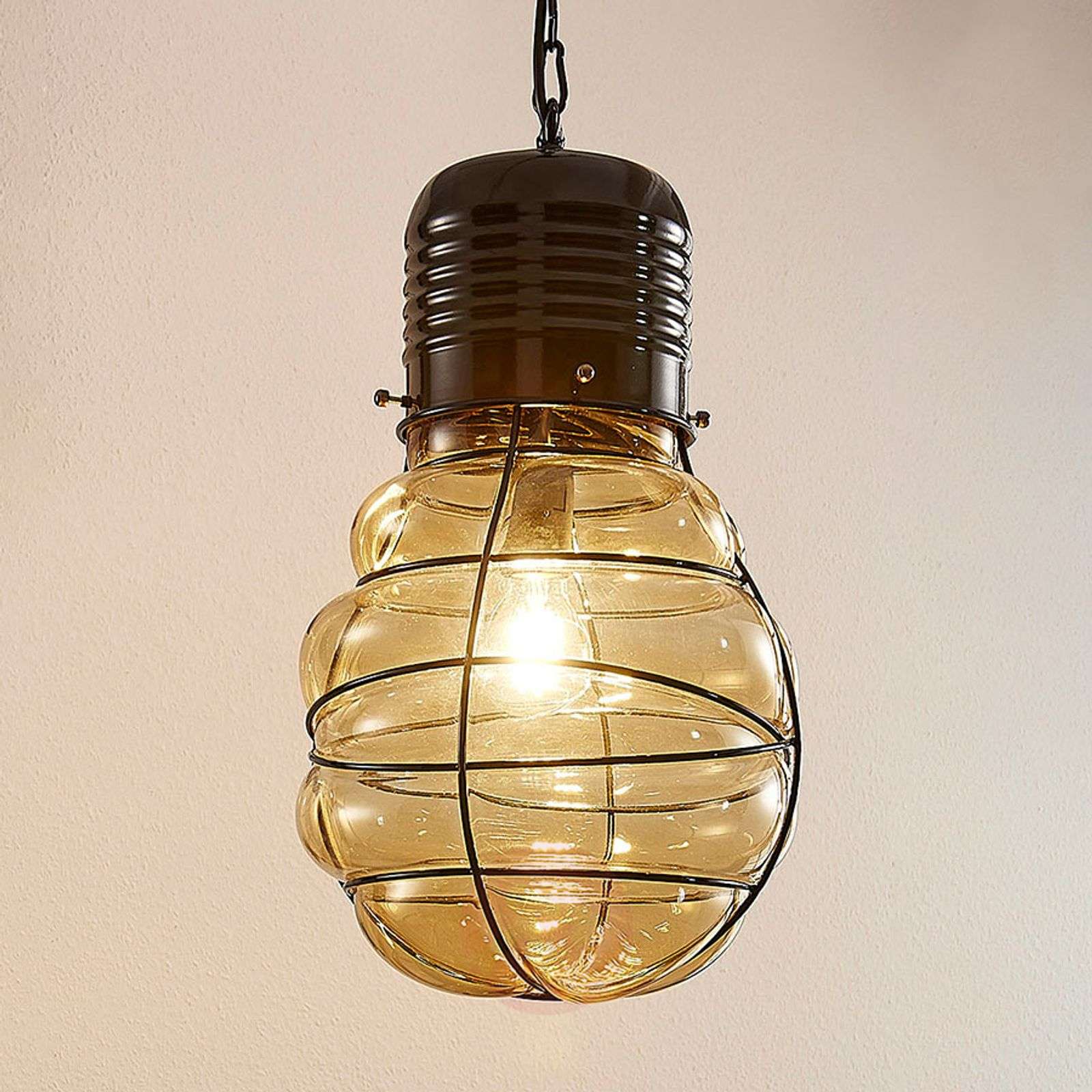 Nostalgicznie wyglądająca lampa wisząca Maluka ze szklanym kloszem w kolorze bursztynu i plecionką z drutu, mającą kształt klatki Maluka to prawdziwy must have dla miłośników nostalgii, ta lampa wisząca bowiem natychmiast przywołuje skojarzenia z wyglądem żarówki żarnikowej. Podstawa wygląd tu jak gwintowana oprawa, a szklany klosz przypomina kolbę, jest jednak rowkowany i ma kolor bursztynu. Odcień szklanego klosza sprawia, że światło staje się cudownie ciepłe i przytulne, a samą lampę można z powodzeniem polecić wszystkim, dla których najważniejsza jest przytulna atmosfera. Klasa efektywności energetycznej: A++