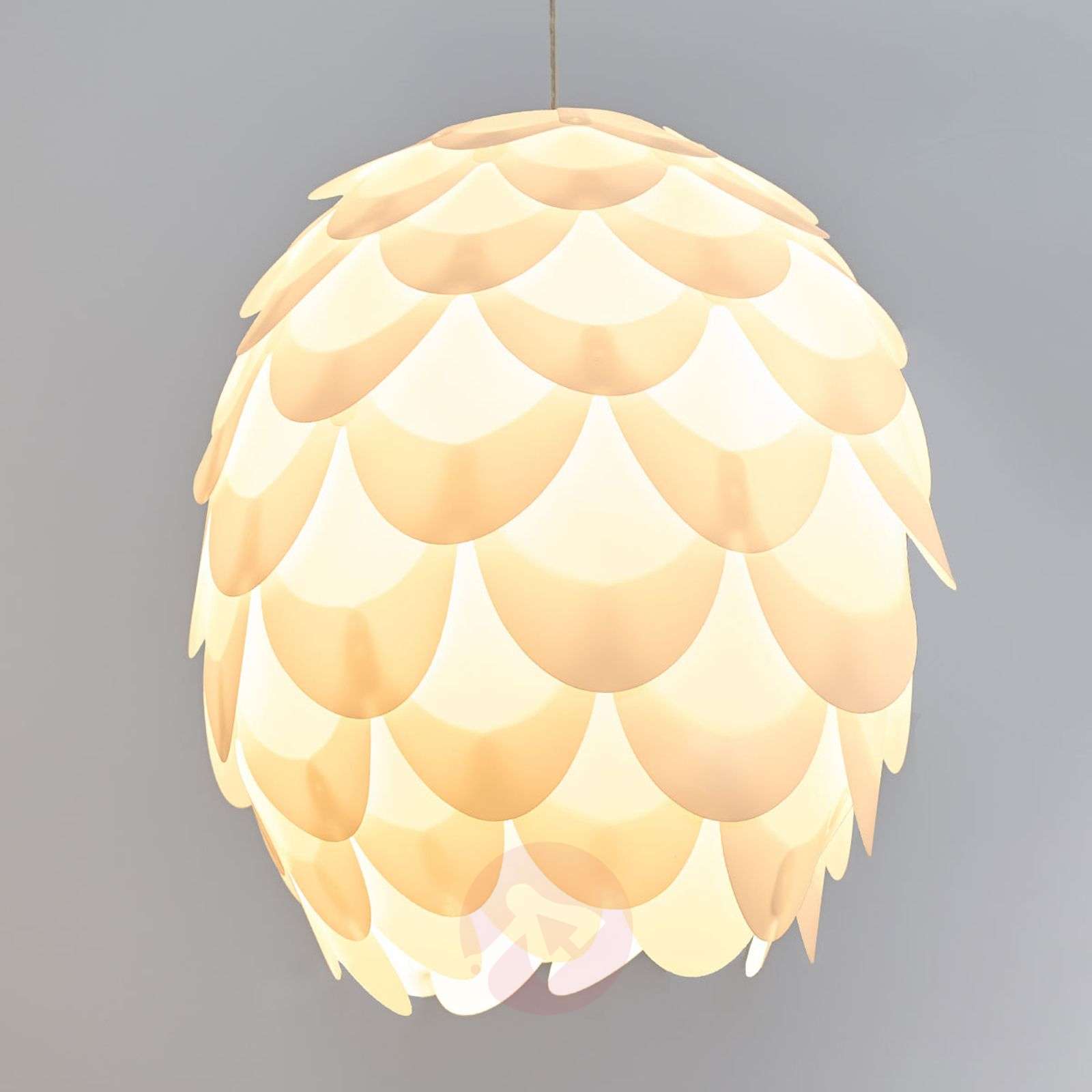 Elegancja pełna bieli dzięki lampie wiszącej Marees Jeśli konsument chce uzyskać efekt nowoczesnej elegancji, lampa wisząca Marees może być doskonałą odpowiedzią na jego potrzeby. W jej wnętrzu znajdują się trzy żarówki, po załączeniu tej lampy wiszącej zapewniające ciepłe światło w całym pomieszczeniu. Wrażenie przytulności powstaje tu dzięki koncepcji designerskiej, zastosowanej w lampie wiszącej Marees: kształt lampy nawiązuje do elementów przyrody i przypomina szyszkę lub sylwetkę ryby. Od subtelnej, stabilnej podsufitki opatrzonej chromowaniem odchodzi smukłe zawieszenie, którego zakończenie stanowi sama lampa o naturalnym kształcie. Światło przenika przez plastikową szyszkę i równomiernie rozchodzi się w pomieszczeniu. Klasa efektywności energetycznej: A++
