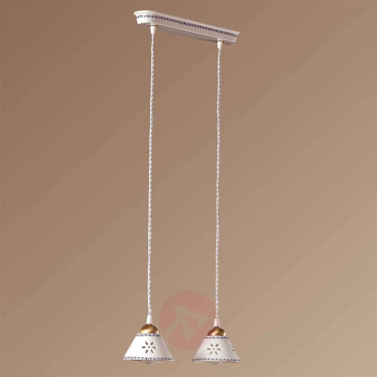 Lampa wisząca NONNA z białej ceramiki Urokliwa lampa wisząca NONNA będzie idealnym wykończeniem wystroju, na przykład jadalni, zaaranżowanej w stylu dworkowym. Jej klosze wykonane z białej ceramiki ozdobione zostały kwiatowym wzorkiem z otworami i delikatnymi paseczkami w kolorze niebieskim, powtarzającymi się również na ceramicznej szynie sufitowej. Główka klosza w kolorze starego mosiądzu harmonizuje pięknie z ceramiką. Lampa błyszczy światłem, którego strumień pada w dół, rozświetlając przyjemnie pomieszczenie. Klasa efektywności energetycznej: A++
