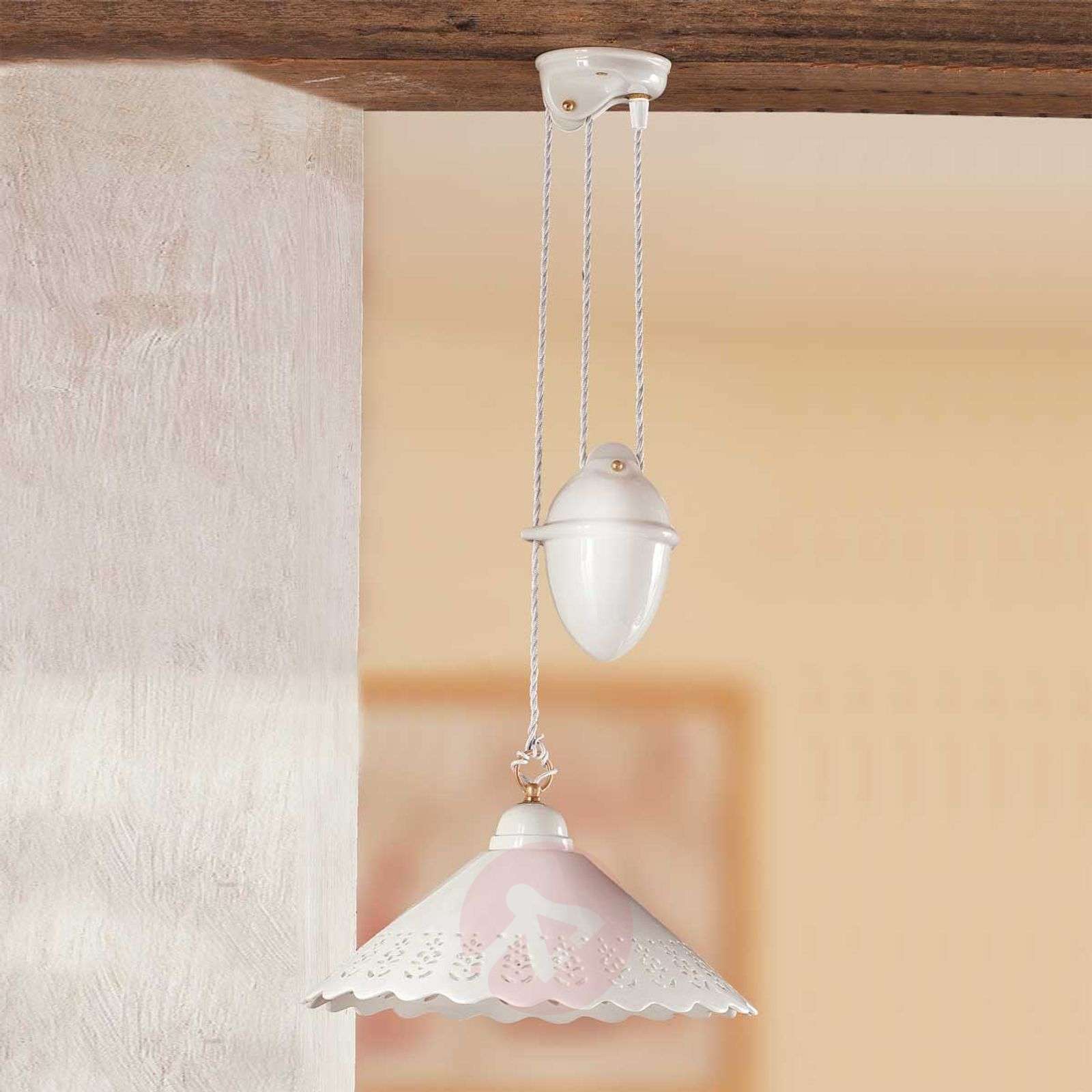 Piękna ceramiczna lampa wisząca PIZZO Czarująca lampa wisząca PIZZO idealnie wpisze się we wnętrza, w których dominuje aura romantyzmu. Ma niezwykle dekoracyjny klosz wykonany z białej ceramiki. Ozdobiony wzorkiem z otworami i delikatnie zaokrąglonymi krawędziami przypomina misternie wykonaną koronkę. Strumień światła lampy pada w dół, a przy pomocy ciężarka można regulować jego natężenie przez dostosowywanie wysokości lampy do indywidualnych potrzeb. Klasa efektywności energetycznej: A++
