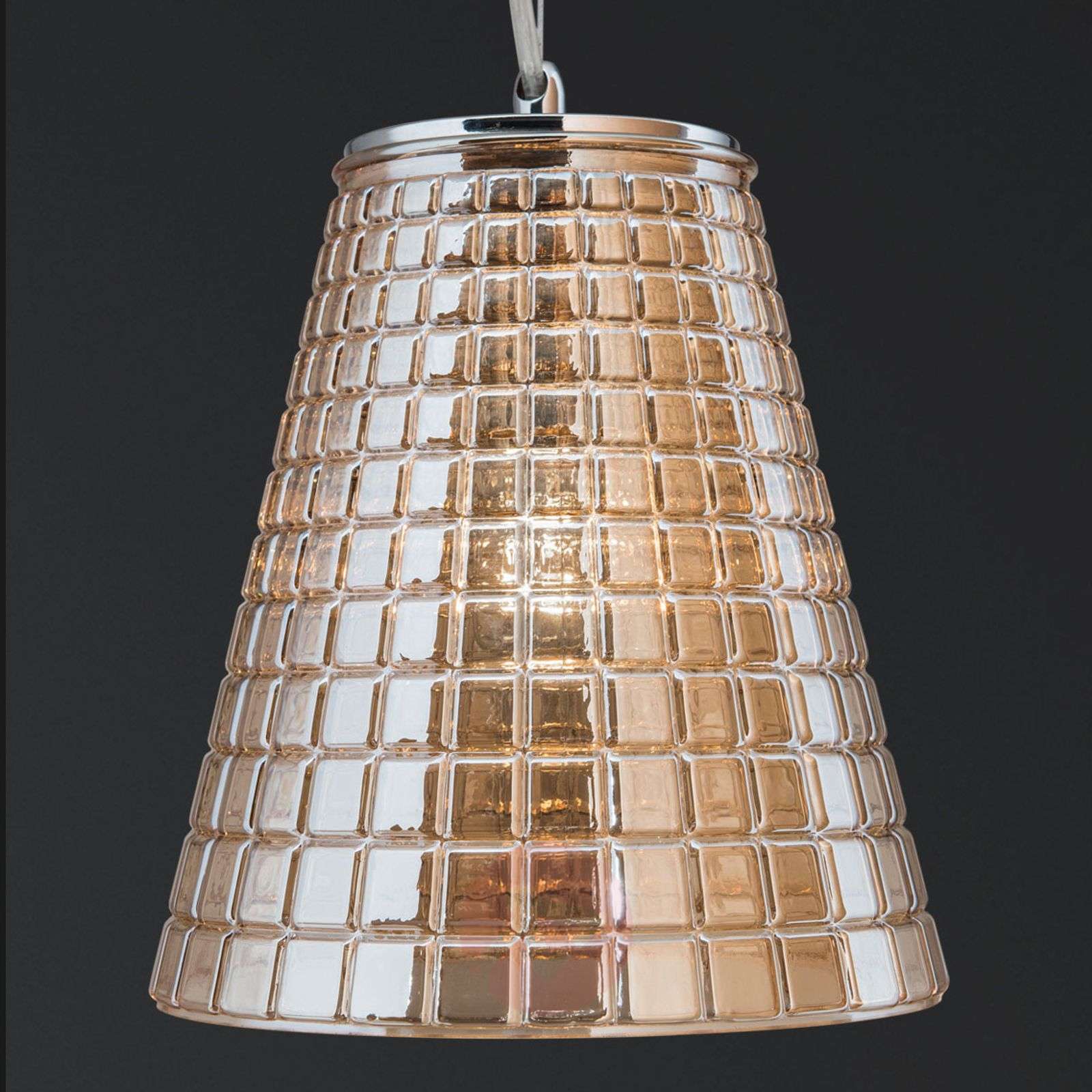 Dwuwarstwowe szkło z diamentowym szlifem: oto lampa wisząca Sarala Stożkowaty klosz lampy wiszącej Sarala jest co prawda nie za duży, jednak zarazem - bardzo wyjątkowy. Dwuwarstwowe szkło opatrzone jest diamentowym szlifem, nadającym mu wyjątkową strukturę. Lampa wisząca Sarala oświetli na przykład stoły w jadalni czy przed kanapą oraz barki. W tym celu można ją powiesić pojedynczo lub w kilku miejscach na suficie, np. w rzędzie/ Klasa efektywności energetycznej: A++