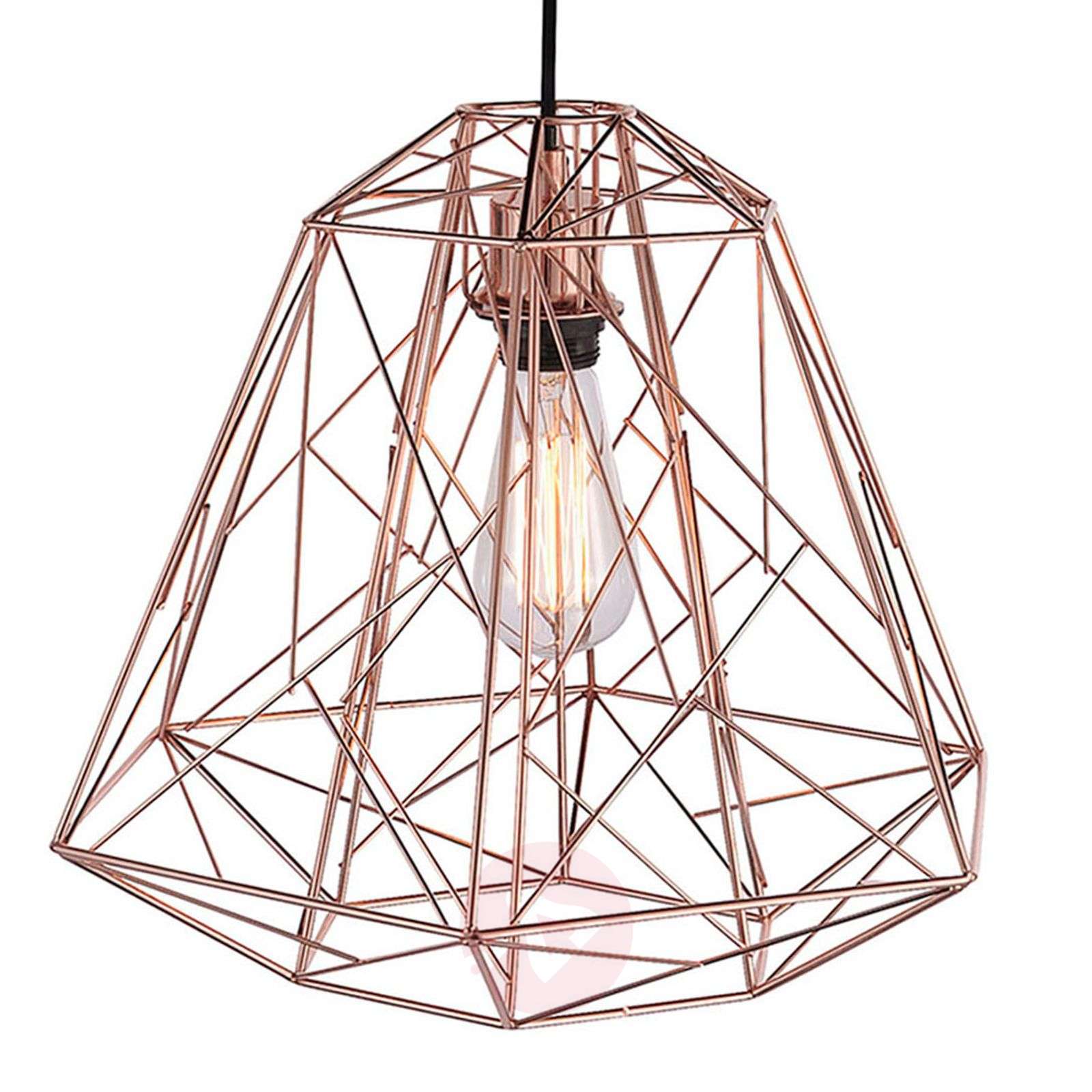 Miedziany blask lampy wiszącej Skeletton Z błyszczących miedzianych prętów składa się klosz lampy wiszącej Skeletton, która ma kształt klatki i wykonana jest w obecnie bardzo modnym stylu vintage. Otwarta forma pozwala dostrzec żarówkę, dlatego zaleca się również zastosowanie żarówki stylizowanej na vintage. Klasa efektywności energetycznej: A++