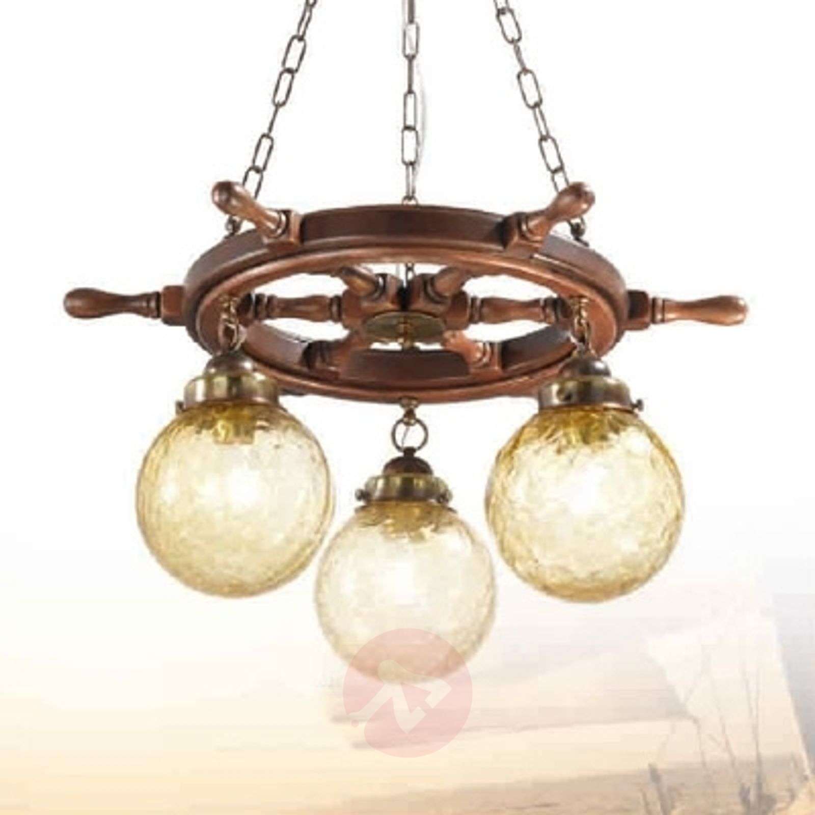 Lampa wisząca Timone emituje światło o ciepłym odcieniu Trzypunktowa lampa wisząca Timone będzie idealnym uzupełnieniem wnętrz urządzonych w stylu marynarskim: zafascynuje swoim wyglądem nie tylko wielbicieli morskich wypraw. Pozwoli na wyczarowanie nastrojowego oświetlenia ogólnego w domu, mieszkaniu, czy urządzonej w stylu marynarskim restauracji. Imitujący koło sterowe okrętu szkielet został wykonany z drewna oraz błyszczącego w niektórych miejscach, zaś w większości stonowanego, brązowanego mosiądzu. Trzy kuliste, bursztynowe klosze o pięknej strukturze zwieszają się z koła sterowego, emitując ciepłe światło. Klasa efektywności energetycznej: A++