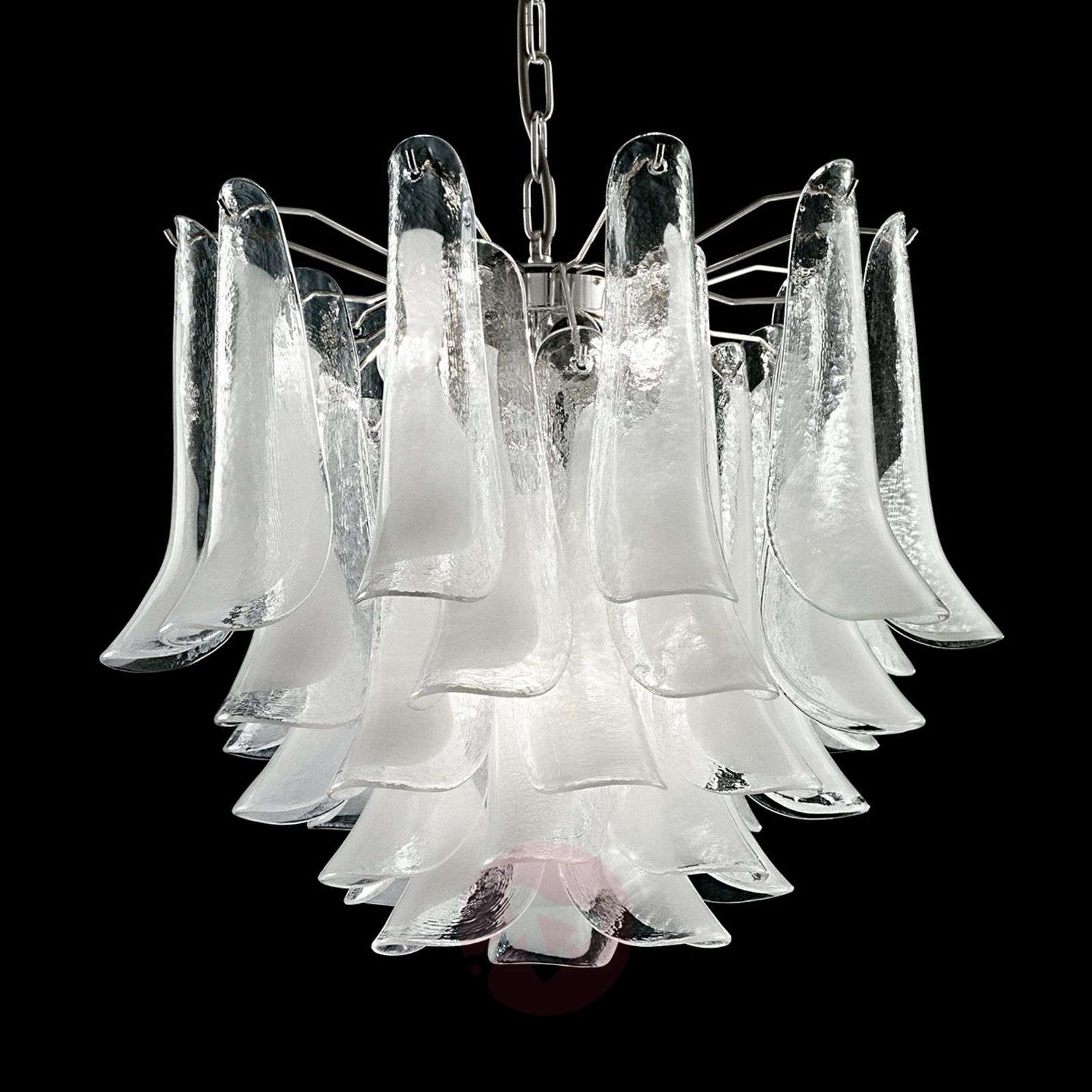 Lampa wisząca Tulipani z przezroczystym i białym szkłem z Murano Źródło światła jest niewidoczne w przypadku tej lampy wiszącej ze szkła z Murano, ponieważ zostało ono zakryte lekko wygiętymi szklanymi elementami. Światło jest przytłumiane przed wypłynięciem i wypełnia pomieszczenie w miękki i równomierny sposób. Szklane dekory przypominają swoim rozmieszczeniem pięknie zdobioną rybę lub upierzenie pięknego ptaka. Poszczególne elementy zostały polakierowane na środki w kolorze białym i zamykają obrzeże, co wygląda niezwykle elegancko. Dekoracyjna lampa wisząca na wiele okazji, do wielu stylów i pomieszczeń. Klasa efektywności energetycznej: A++
