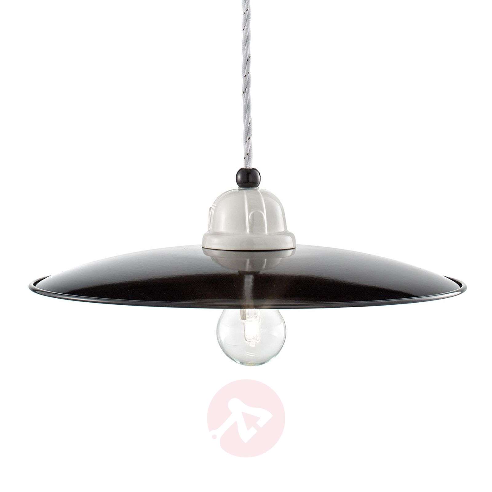 Minimalistyczna lampa wisząca retro C1612 w kolorach czarnym i białym Lampa wisząca C1612 z błyszczącymi czarno-białymi powierzchniami ceramicznymi nadaje współczesny wygląd tej lampie, przywołując jednocześnie styl z przeszłości. Design lampy jest zatem idealny zarówno do wnętrz w stylu retro, jak i do pomieszczeń nowoczesnych. Szczególny efekt daje fakt, że światło emitowane jest z wnętrza czarnego klosza, wykonanego z ceramiki. Ta lampa wisząca C1612 jest wytwarzana ręcznie we Włoszech zgodnie z tradycyjnymi metodami produkcji, które były przekazywane z pokolenia na pokolenie właśnie we Włoszech. Charakterystyczne dla tej oprawy są wyraźne kształty, błyszczące kolory i tylko drobne detale, takie jak śruby nośne przy rozecie sufitowej. Ta lampa wisząca wygląda szczególnie stylowo, gdy jest wyposażona w żarówkę filamentową w stylu retro lub taką posiadającą element podobny do włókna węglowego. Wyprodukowano we Włoszech. Klasa efektywności energetycznej: A++