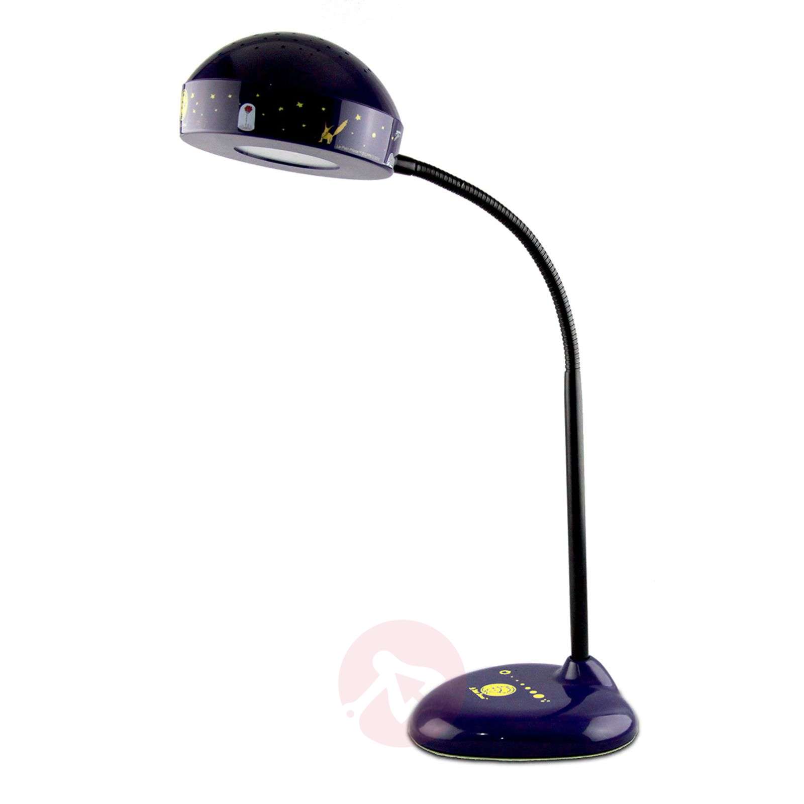Ściemniana lampka biurkowa LED Mały Książę do równomiernego oświetlania pokoju dziecięcego jasnym światłem „Mały Książę” to popularna opowieść zarówno dla młodych, jak i starszych, która w sposób przystępny dla dzieci odwołuje się do prostych, ale ważnych prawd o przyjaźni i człowieczeństwie. Dzieciom pozostaje ona także w pamięci dzięki wspaniałym ilustracjom. Ta lampka biurkowa LED na niebieskim kloszu ma motyw Małego Księcia. Oprócz światła na biurko, mającego barwę uniwersalnej bieli, ta lampka oferuje jednak coś jeszcze: W górnej części klosza znajdują się małe otwory, a za nimi kolorowe diody LED RGB. Dzięki temu na suficie powstaje piękny efekt gwiaździstego nieba, sam zaś sprzęt służy jako lampka nocna dla dzieci, stanowiąca źródło kojącego światła. Z kolei możliwość zmiany barw sprawia, że lampa może świecić w siedmiu różnych kolorach. Zamontowany czujnik dotykowy umożliwia ściemnianie światłą diod LED zamontowanych w lampie biurkowej, a efekt pamięci umożliwia automatyczne ustawienie ostatniego wybranego poziomu jasności przy każdym włączeniu. Klasa efektywności energetycznej: A+