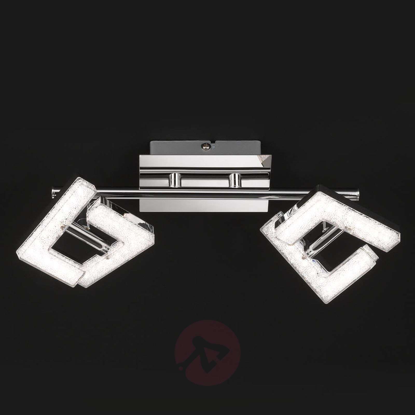 2-punktowa lampa sufitowa Lea z efektem kryształowym Chromowana lśniąca lampa sufitowa LED Lea wyróżnia się formą dwóch kanciastych elementów LED, które można ustawiać pod dowolnym kątem. Zainstalowane w nich diody LED emitują przyjemne światło o barwie ciepłej bieli, zdobione dodatkowo pięknym efektem kryształowym. Klasa efektywności energetycznej: A+