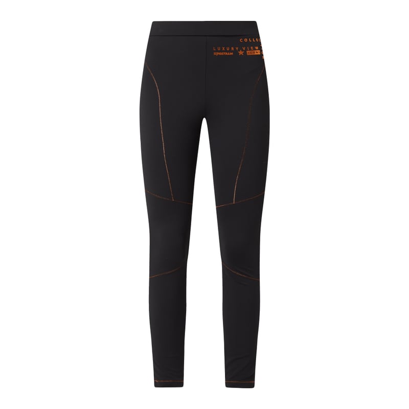 Legginsy damskie SPORTALM , Mieszanka materiałów z dodatkiem streczu , Dopasowany krój , Elastyczny pas , Metaliczny nadruk , Ozdobne szwy z efektownej przędzy , Kieszeń zapinana na zamek błyskawiczny z tyłu , Długość wewnętrzna nogawki w rozmiarze 36: 71 cm