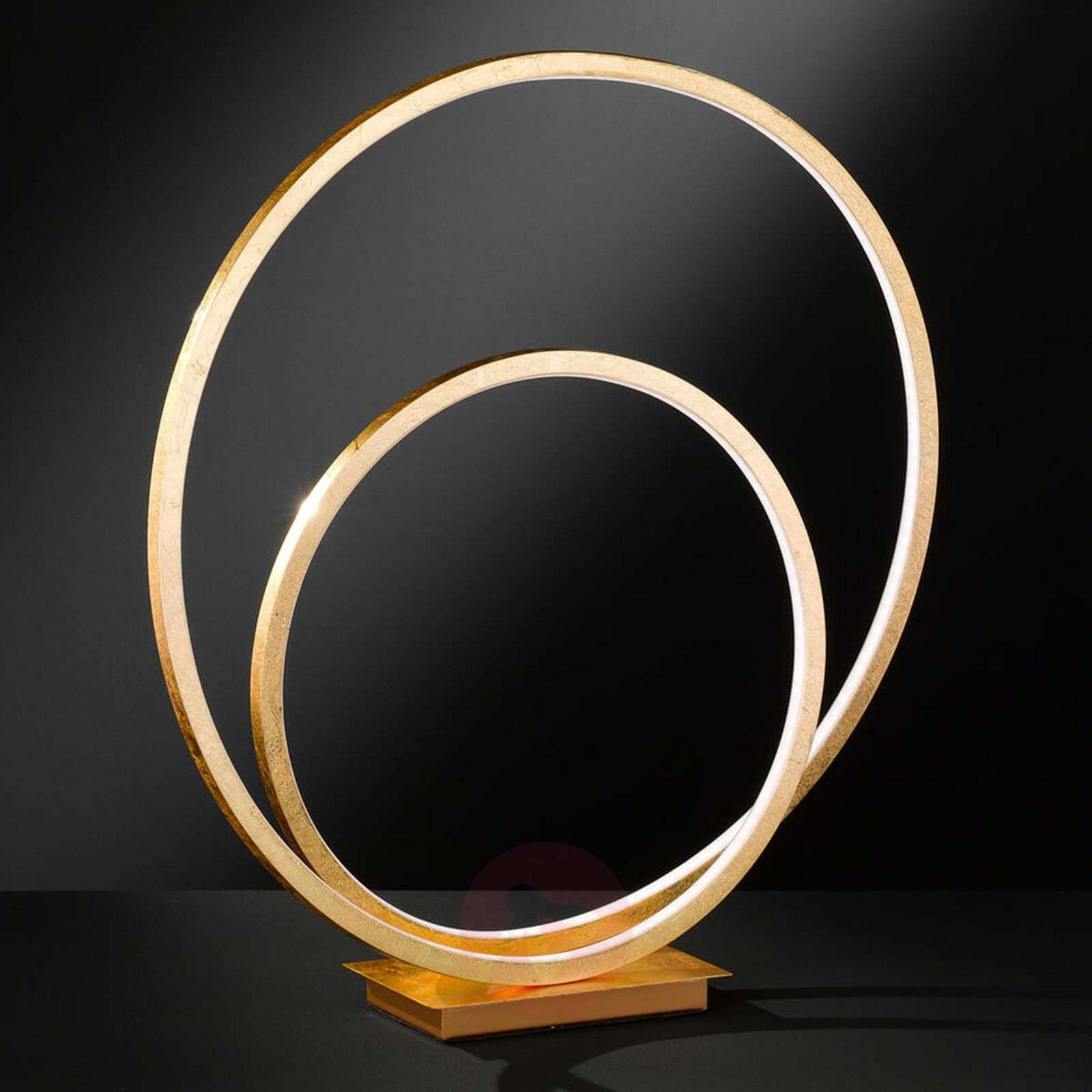 Lampa stołowa LED Loris w złotym kolorze z 3-stopniowym ściemniaczem dotykowym Nietypowy klosz w atrakcyjnym, szlachetnym kolorze i regulowane oświetlenie – tak prezentuje się lampa stołowa LED Loris. Klosz tworzą dwa, różnej wielkości wąskie pierścienie z zainstalowanymi po wewnętrznej stronie diodami LED emitującymi przyjemne pośrednie światło. Satynowane osłony zapewniają efekt nieoślepiającego rozproszenia, a ściemniacz dotykowy regulację jasności w 3 stopniach intensywności. Jednym słowem Loris to lampa stołowa, która zachwyca elegancją i przekonuje energooszczędnością. Klasa efektywności energetycznej: A+