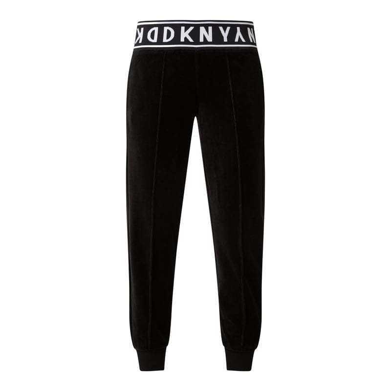 Luźne spodnie damskie DKNY , Mieszanka bawełny , Luźny krój , Plusz , Szeroki, elastyczny pasek z logo , Wpuszczane kieszenie , Przeszyte kanty , Zakończenia nogawek z prążkowanym ściągaczem , Długość wewnętrzna nogawki w rozmiarze S: 68 cm