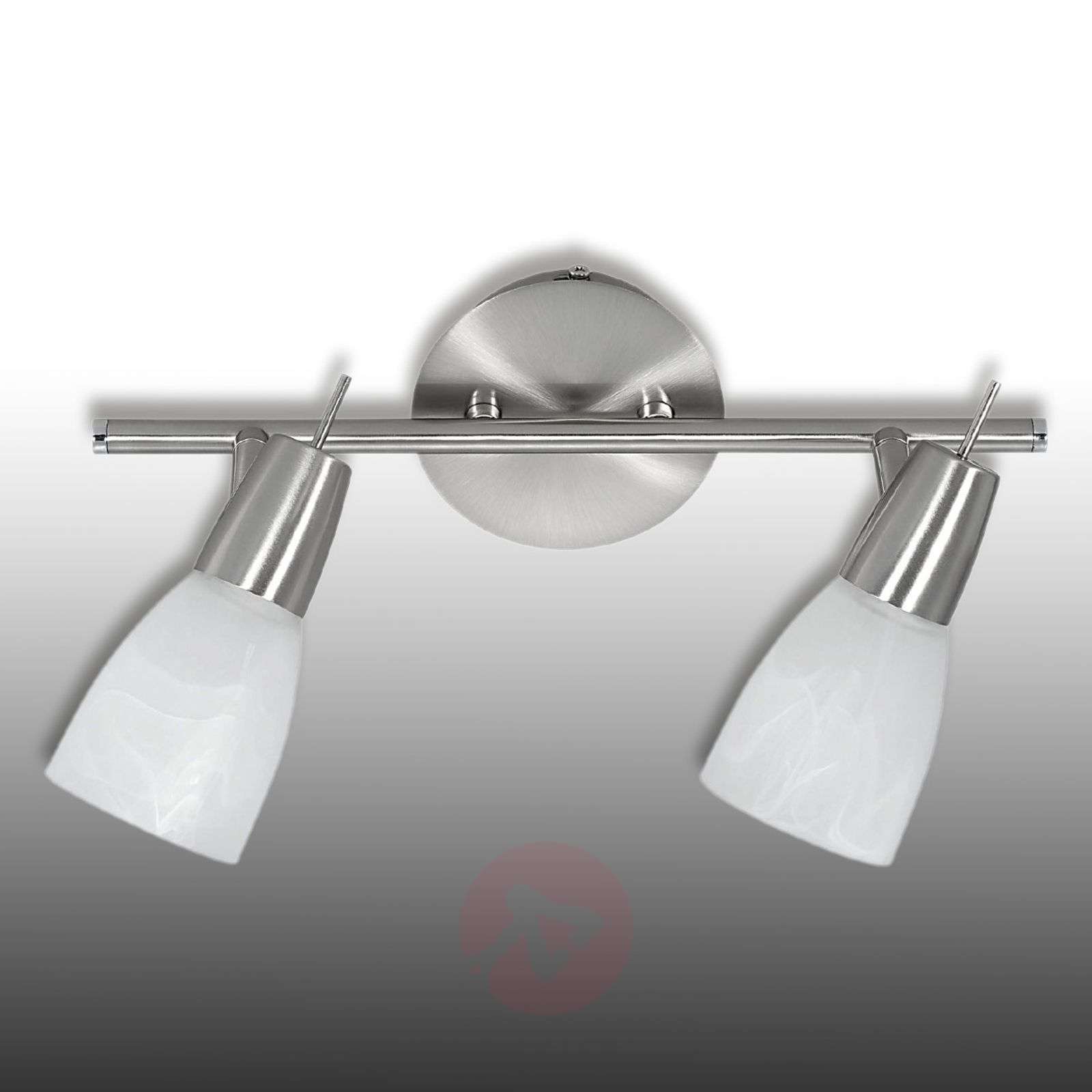 Lampa sufitowa LED JULIA z kloszami z marmurkowym efektem – 2-punktowa W ponadczasowej i nowoczesnej lampie sufitowej LED JULIA w kolorze stali wzrok skupia się na jej kloszach, które nadają jej wyjątkowy charakter. Zostały wykonane ze szkła z delikatnym marmurkowym wzorem, które rozprasza światło, tworząc piękne efekty. Reflektory można w dowolny sposób regulować w zależności od potrzeb. Dostawa obejmuje żarówki (2 x 4 W LED GU10). - Barwa światła: ciepła biel - 3 000 kelwinów - 800 lumenów Klasa efektywności energetycznej: A+