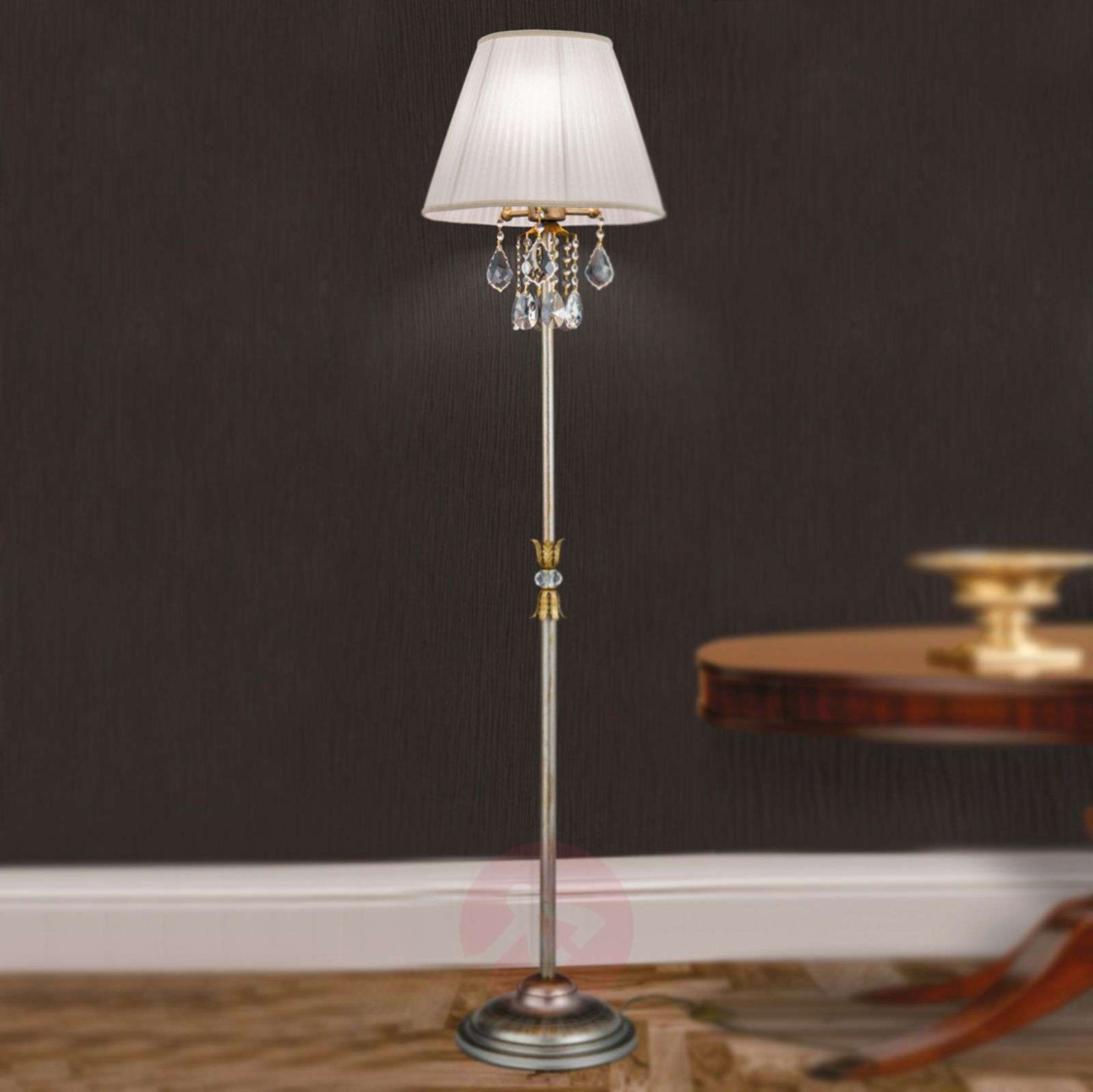 Lampa stojąca z materiału MIRAMARe w stylu weneckim Podstawa i oprawa lampy stojącej MIRAMARE, która wyglądem nawiązuje do stylu weneckiego, mienią się w kolorach złota i srebra. Wieńczący lampę abażur z cienkiej organzy w prostym białym kolorze rozprasza światło w pokoju, tworząc przytulną poświatę oświetlającą dużą powierzchnię, i .dodatkowo podświetla zdobiące oprawę kryształy Asfour, które cudownie się mienią Lampa oświetlana jest przez trzy żarówki świeczki o mocy maks. 40 W. Nie są one zawarte w zestawie, dlatego należy je nabyć osobno w dziale „Akcesoria”. Wspaniała lampa, która doda charakteru każdemu eleganckiemu wnętrzu. Klasa efektywności energetycznej: A++