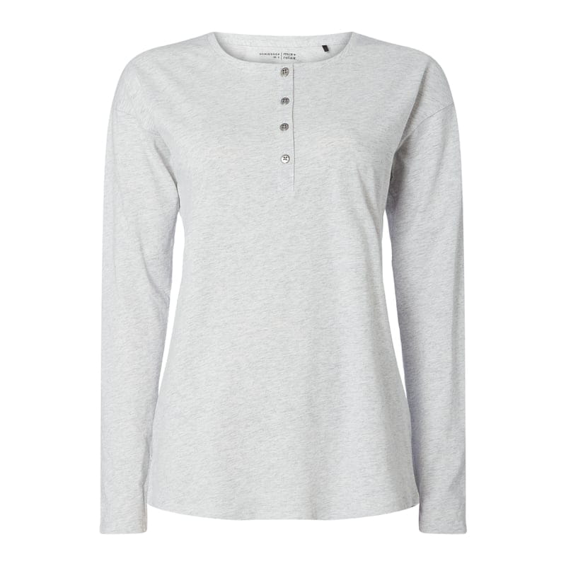 Koszulka serafino damska SCHIESSER, Czysta bawełna , Lekko talkowany krój , Melanż, Okrągły dekolt , Krótka listwa guzikowa , Obniżone ramiona, Mix & Relax, Długość tyłu w rozmiarze 36: 66 cm
