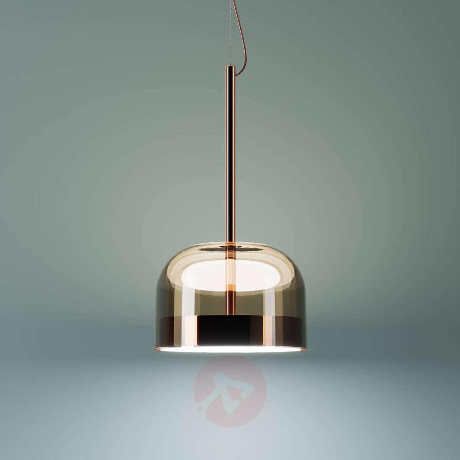 Nowa interpretacja lamp kloszowych: lampa wisząca LED Equatore Na pierwszy rzut oka model Equatore wydaje się być klasyczną lampą wiszącą ze szklanym kloszem. Gdy jednak przyjrzeć się jej wnętrzu i sposobowi działania, szybko zorientujemy się, że klasyczny model lampy wiszącej doczekał się w modelu Equatore nowej interpretacji. W przypadku tej lampy kloszowej źródło światła nie jest zlokalizowane w obrębie klosza, wzgl. dyfuzora, lecz przy dolnej krawędzi, gdzie miedziana taśma opasuje półkolisty klosz szklany niczym równik kulę ziemską. Stąd też wzięła się włoska nazwa lampy: Equatore. Źródło światła LED znajduje się w osłonie, która od dołu zamyka klosz. Świecący dysk kieruje światło z jednej strony w górę do klosza, a z drugiej strony również w dół, np. na powierzchnię stołu. Serię lamp Equatore zaprojektowali dwaj Włosi – Gabriele i Oscar Buratti. Obaj architekci mieszkają i pracują w Mediolanie, zajmując się projektami architektury budowlanej poprzez aranżację krajobrazu aż po projektowanie mebli i innych przedmiotów wyposażenia wnętrz, takich jak np. lampy. Dla producenta lamp Fontana Arte zaprojektowali oni serię modeli Equatore. Klasa efektywności energetycznej: A+