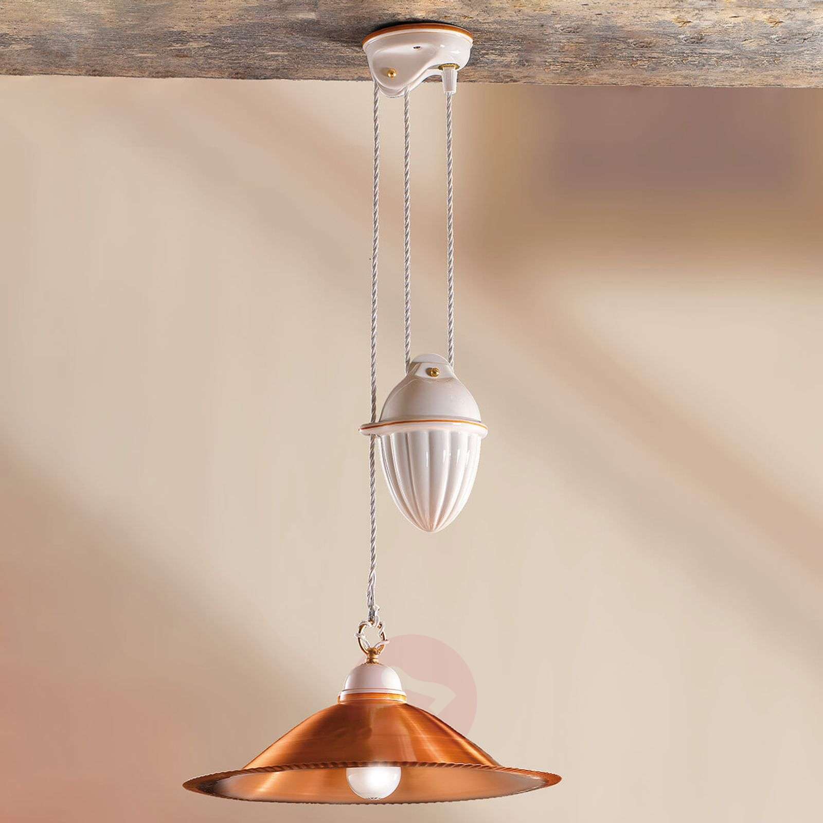 Lampa wisząca z regulacją wysokości Luiza z miedzianym kloszem Białe ceramiczne mocowanie sufitowe i miedziany klosz lampy razem tworzą harmonijną całość. Dzięki wypolerowanej powierzchni światło jest odbijane w sposób miły dla oka, a jednocześnie nie oślepia. Z kolei biały ceramiczny ciężarek umożliwia regulację wysokości zawieszenia w zakresie od 91 cm do 181 cm. Lampa wisząca Luiza pasuje szczególnie do rustykalnych stylów aranżacji wnętrz. Klasa efektywności energetycznej: A++