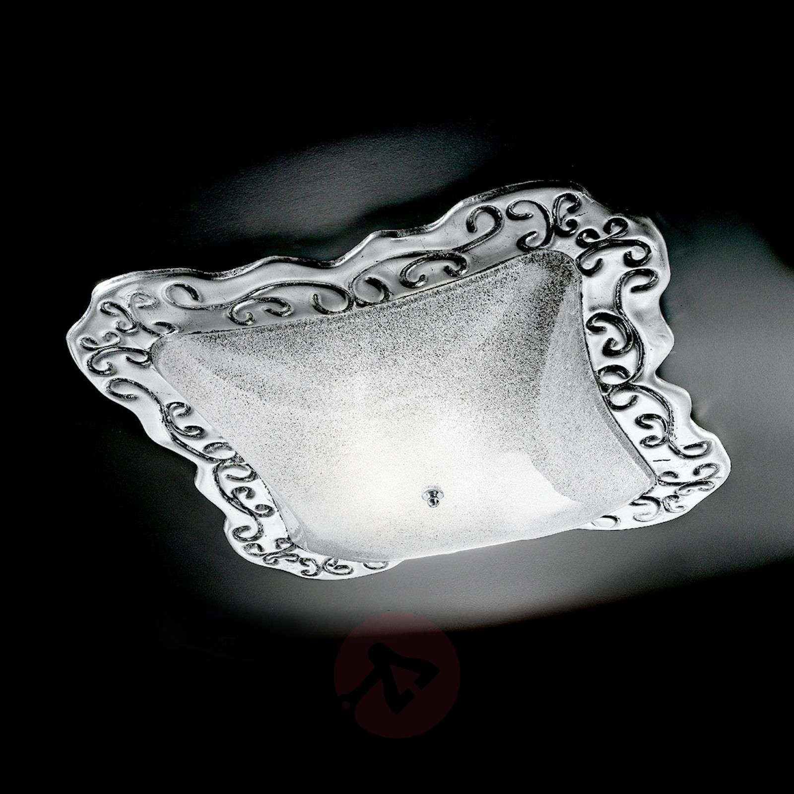 Lampa sufitowa ze szkła z brzegiem zdobionym w kolorze srebrnym Ta lampa sufitowa jest wykonana praktycznie tylko ze szkła, dzięki temu wygląda wyjątkowo pięknie. Klosz jest w zasadzie przezroczysty na środku, jednak posiada niezliczone małe bąbelki powietrza, przez co osiąga się miłe i równomierne światło w pomieszczeniu. Wykonany także brzeg ze szkła został polakierowany w kolorze srebrnym i posiada wijące się zdobienie. Lampa sufitowa Miro nadaje się wyśmienicie do pomieszczeń w klasycznym stylu, pasuje jednak także jako element kontrastujący do stylu nowoczesnego dzięki swojemu wdzięcznemu wyglądowi. Klasa efektywności energetycznej: A++