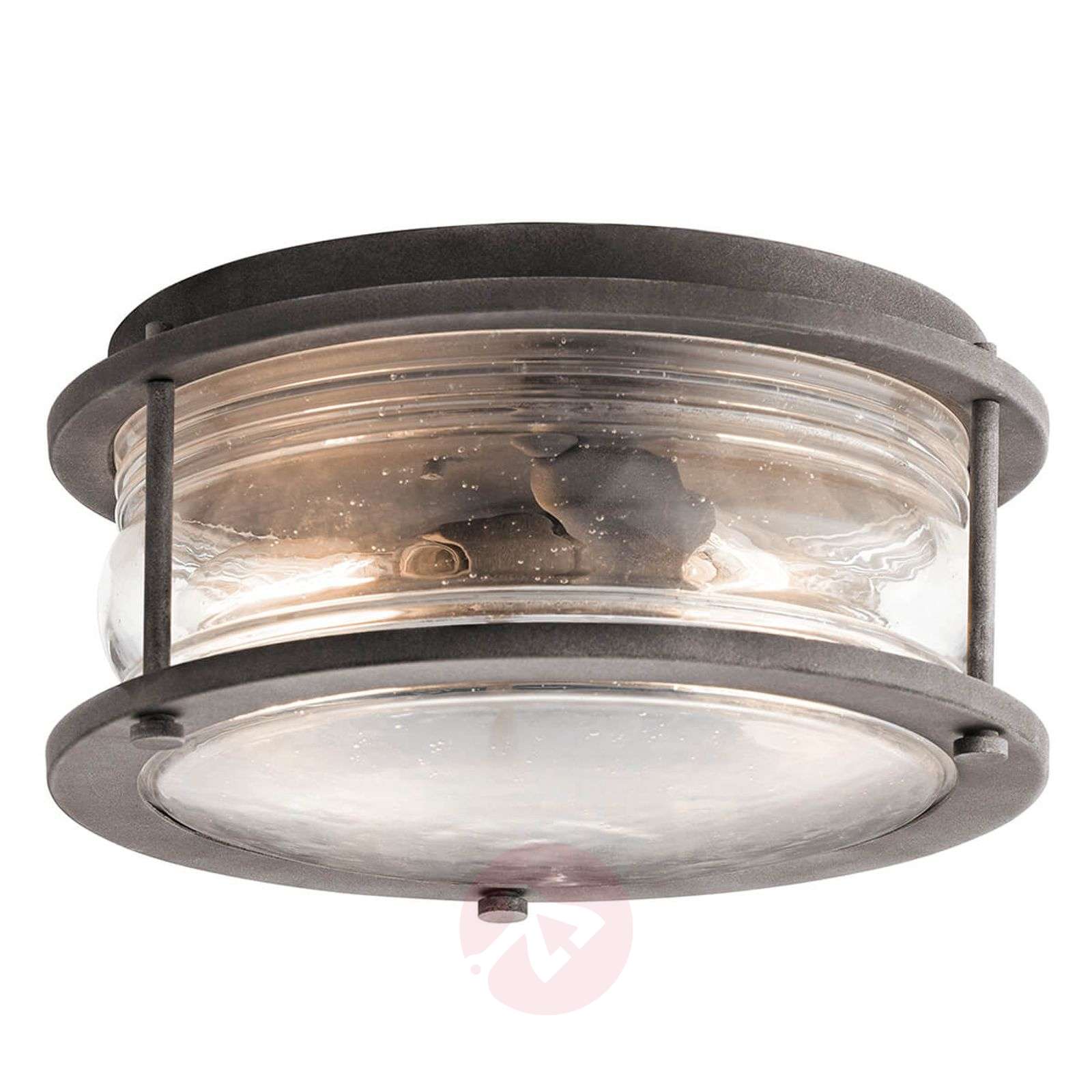 Okrągła lampa sufitowa Ashland Bay, zewnętrzna Lampa sufitowa Ashland Bay jest nie tylko zabezpieczona przed opryskaniem wodą, ale również bardzo wytrzymała. Lampa do zadaszonych miejsc na zewnątrz, na przykład do zamontowania pod pergolą. Szklany klosz jest przezroczysty i pozwala wydostawać się światłu dookoła. W ten sposób powstaje harmonijne oświetlenie zewnętrzne, mające swego rodzaju przytulny blask. Lampa zaś z racji tego, że ma powierzchnię przypominającą elementy ocynkowane, poddane wpływom atmosferycznym, pasuje do wielu typów aranżacji podwórka. Klasa efektywności energetycznej: A++