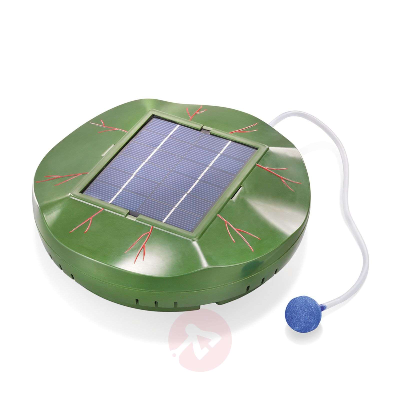 Napowietrzacz Floating Air napowietrza staw ogrodowy za pomocą energii słonecznej Floating Air to pływający napowietrzacz odpowiedni do każdego stawu ogrodowego, a do tego działający bezpłatnie, dzięki zasilaniu energią słoneczną. Napowietrzacz Floating Air jest wyposażony we wbudowaną pompę powietrzną, dostarczającą powietrza do stawu przez wąż i kamień powietrzny. Wąż powietrzny, wtykany na spodzie napowietrzacza, można skracać. Dane techniczne: - przepływ powietrza: 120 l/h - długość węża: 0,5 m - średnica kamienia napowietrzającego: 30 mm - wymiary: Ø 25 cm, wysokość 6,5 cm - Waga: 660 g - zalecana wielkość stawu 500 do 2 000 l
