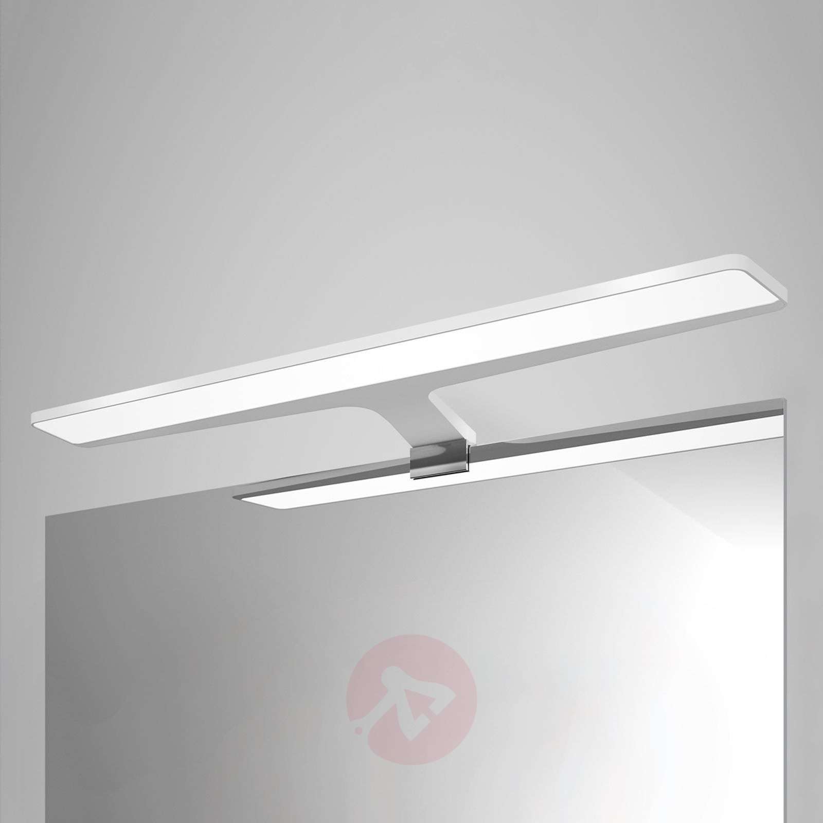 Białe oświetlenie lustra LED Nayra - również jako oświeltnie mebli Oświetlenie lustra LED Nayra zostało wykonane jako niezwykle płaska lampa, zaledwie 0,9 cm wysokości. Poprzez satynowany dyfuzor z wysokiej jakości tworzywa sztucznego białe jak światło dnia światło LED świeci pod kątem 113° i rozjaśnia obszar pod lustrem. Nayra zainstalowana na meblach może zadba o jasne oświetlenie na przykład szafy z ubraniami. Dostawa obejmuje również zasilacz LED, który można ukryć za szafą czy lustrem na kablu o długości 35 cm. Klasa efektywności energetycznej: A+
