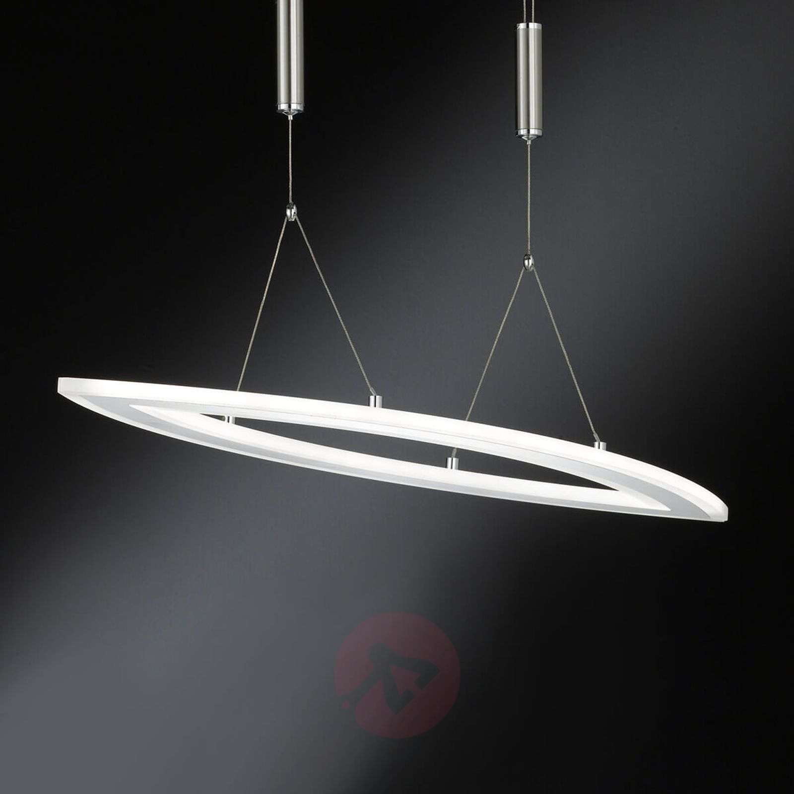 Regulowana na wysokość lampa wisząca LED Nevil w kształcie elipsy, z praktycznym ściemniaczem Matowa, niklowana powierzchnia i kształt elipsy – tak prezentuje się lampa wisząca Nevil, która nie tylko optymalnie oświetli stół w jadalni, ale i doskonale ozdobi wnętrze. Delikatne zawieszenie z linki z obciążnikami umożliwia regulowanie wysokości klosza odpowiednio do wysokości stołu (od 100 cm do 150 cm). Ponadto oprawa świetlna jest wyposażona w innowacyjną funkcję ściemniacza, który w połączeniu ze standardowym przełącznikiem ściennym pozwala dostosować jasność lampy do otoczenia. Wystarczy kilkukrotnie nacisnąć przełącznik, by zmniejszyć jasność diod LED o barwie ciepłej bieli. Klasa efektywności energetycznej: A+