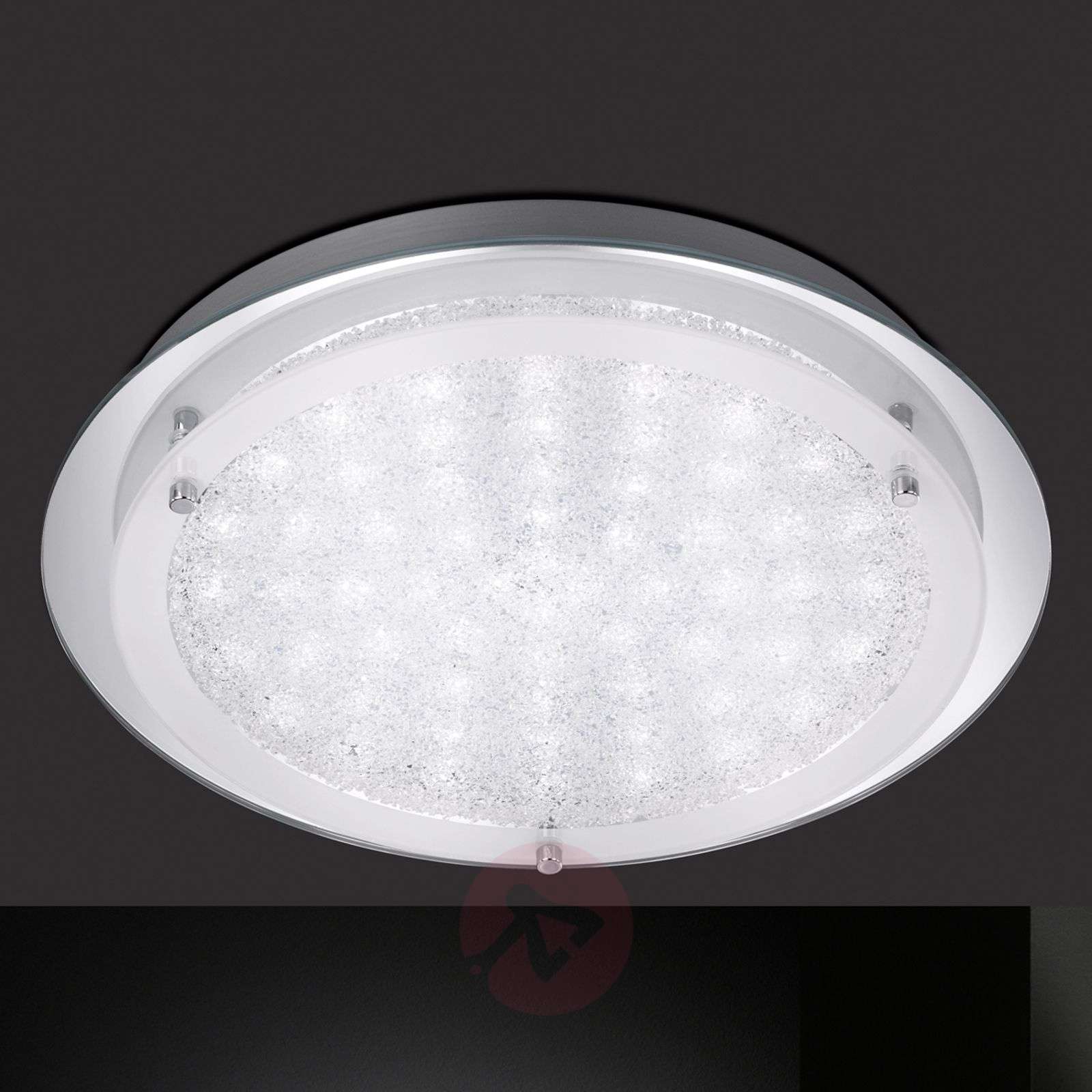 Okrągła lampa sufitowa Mora z częściowo satynowaną szklaną szybą Dekoracyjne, przezroczyste krawędzie okrągłego szkła okrywającego od góry do dołu emitujące ciepło-białe światło żarówki LED lampy sufitowej Mora zapewniają przepiękny kontrast z równie okrągłym, chromowanym mocowaniem sufitowym. Jasne, przyjemne światło pięknie i równomiernie przenika przez satynowaną powierzchnię szkła i zapewnia pomieszczeniu doskonałą atmosferę. Solidnie zamocowane w oprawie wykonane w technologii LED żarówki cechuje wyjątkowo duża trwałość wynosząca 20 000 godzin. Klasa efektywności energetycznej: A