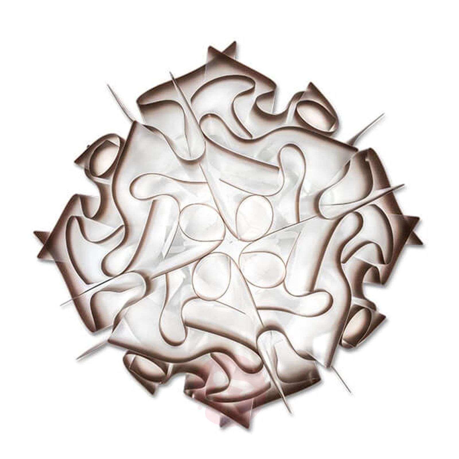 Nowoczesna designerska lampa sufitowa VELI Niezwykła forma designerskiej lampy VELI sprawia, że stanowić będzie doskonałą ozdobę sufitu bądź ściany. Przykuwa uwagę wyjątkową nowoczesną i innowacyjną formą. Dostępna jest w trzech subtelnych kolorach, które zapewniają nastrojowe oświetlenie. Lampę można umieścić na suficie lub ścianie za pomocą praktycznego systemu z magnesem. Dzięki niemu klosz lampy można łatwo zdjąć Ułatwia to nie tylko wymianę żarówki, ale również czyszczenie lampy. Wizjonerskie lampy tworzone przez designerów we Włoszech - Slamp Włoska kuźnia designerów Slamp z siedzibą w Rzymie została założona na początku lat 90. XX wieku. przez Roberto Zilianiego. Ziliani już wcześniej działał twórczo zanim odkrył swoją pasję i możliwości, jaki daje światło. Spełniające najwyższe standardy materiały, wykonanie i jakość Marka Slamp kładzie szczególny nacisk na tworzenie nowych materiałów. Oprócz naturalnych i tradycyjnych surowców takich jak skóra, miedź, kryształ czy stal szlachetna firma Slamp wykorzystuje również własne opatentowane materiały jak Cristalflex®, Opalflex® i Lentiflex®. Dzięki nim możliwe jest stworzenie wyjątkowych efektów świetlnych. Na przykład materiał Lentiflex® służy jako woda, która w zależności od kąta patrzenia zmienia kolor. To właśnie własne materiały marki Slamp oraz powstałe z nich lampy są silnymi atutami firmy. Należą do nich również między innymi spory poziom innowacji, kreatywności oraz oryginalności, a także doskonałe wyczucie działania światła. Klasa efektywności energetycznej: A++