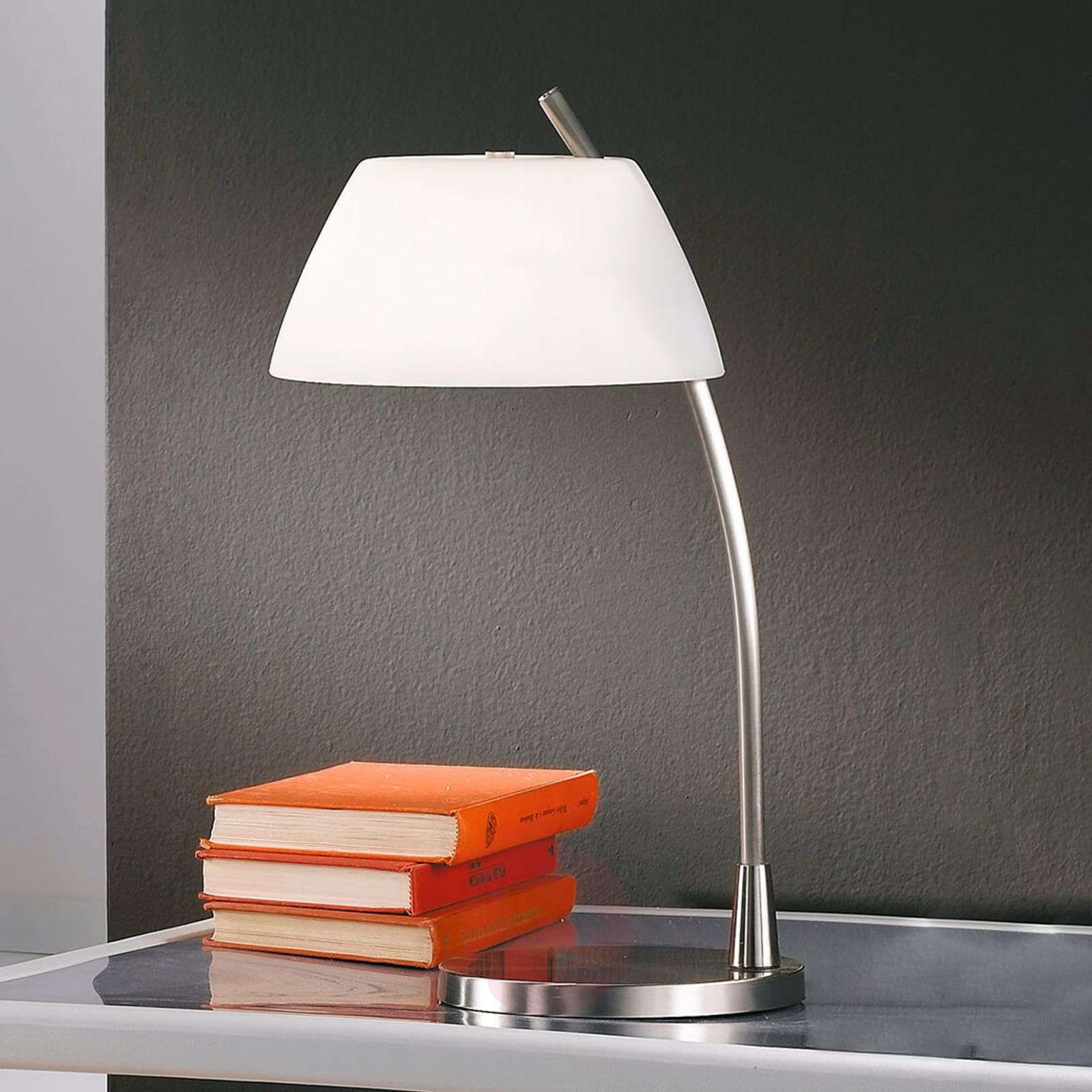 Niklowana lampa stołowa Malmö z atrakcyjnym szklanym kloszem Ta lampa stołowa z serii Malmö spod znaku Kolarz prezentuje się bardzo elegancko i stylowo. Drobne metalowe elementy są niklowane, przez co lampa wygląda bardzo nowocześnie. Biały szklany klosz zapewnia efektywny rozsył światła. Lampa stołowa Malmö tworzy harmonię z licznymi stylami wystroju i przyczynia się do powstania nastrojowej atmosfery. Wbudowany ściemniacz dotykowy umożliwia dowolną regulację natężenia oświetlenia. Klasa efektywności energetycznej: A++
