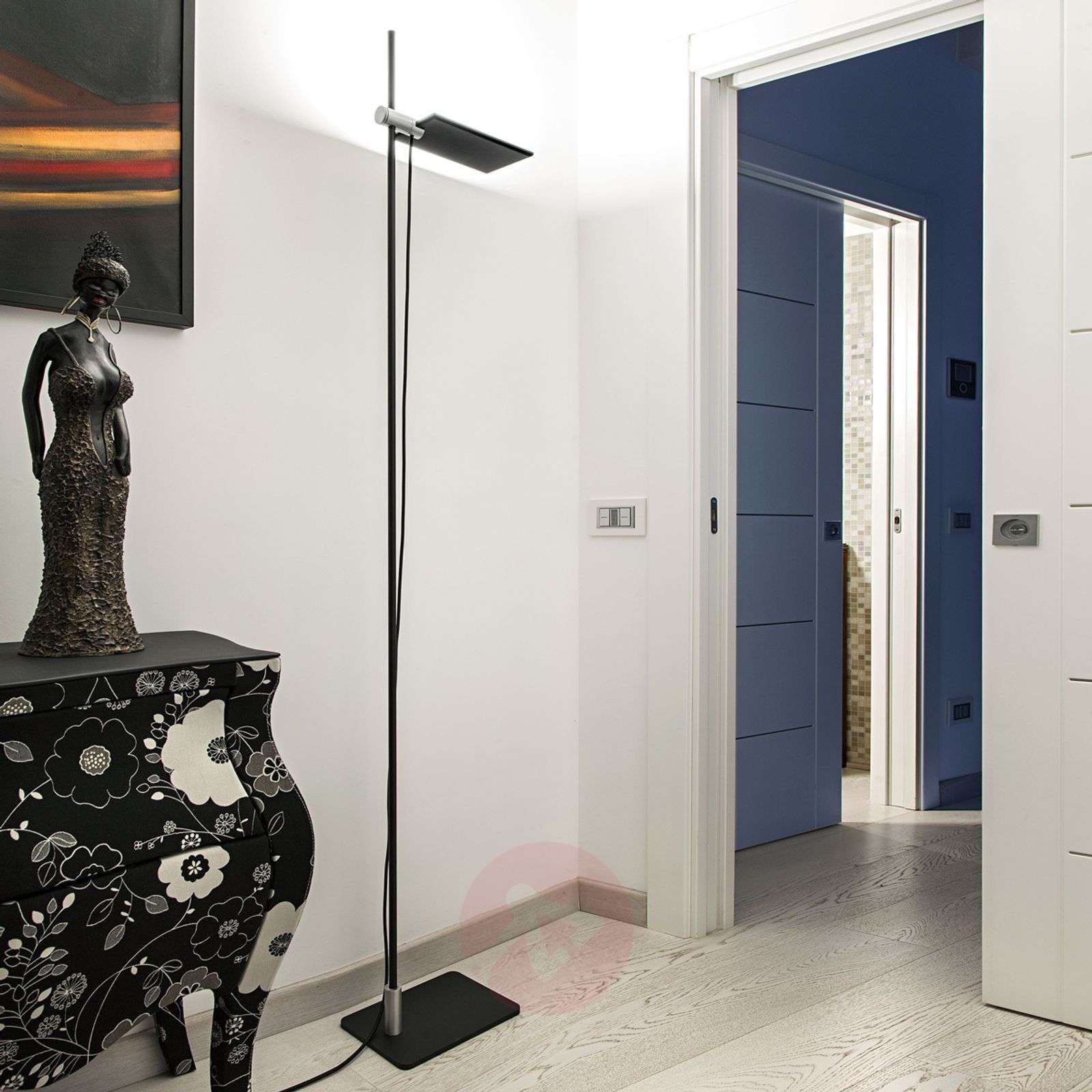 Purystyczna lampa stojąca LED GiuUp ze ściemniaczem Prawie cała ta lampa stojąca LED ma kolor czarny, jedynie przegub między główką lampy a jej podstawą i mały element nad kanciastą stopą mają inny, srebrny kolor. Całkowicie płaska główka lampy, tak jak naświetlacz, może emitować światło na sufit, co daje ogólne wrażenie przytulności. Można też jednak ustawić lampę tak, by dawała światło bardziej bezpośrednie. Przeguby w lampie dają bowiem możliwość odchylania jej na boki. Wysokość można również regulować, przesuwając główkę lampy wzdłuż pręta w górę lub w dół. Diody LED, zamontowane w tej lampie stojącej, są niezwykle mocne. Jeśli uznamy że ich światło jest zbyt jasne, możemy je ściemnić do optymalnego poziomu, korzystając ze ściemniacza. Klasa efektywności energetycznej: A+