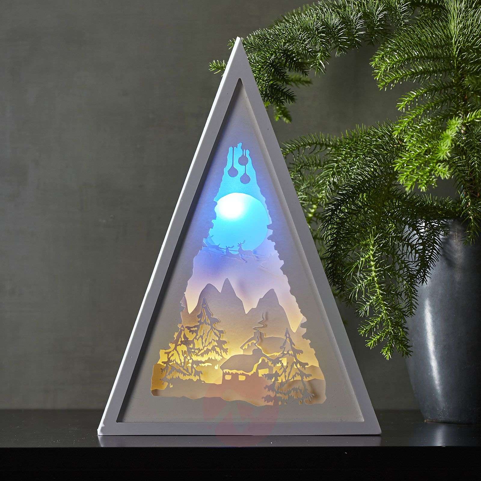 Imponujący obraz LED Scenery krajobraz Trójkątny obraz LED Scenery krajobraz zapewnia przytulny nastrój w całym pomieszczeniu i najładniej wygląda w ciemności. Przedstawiony na nim krajobraz jest szczególnie bogaty w kontury po włączeniu światła w ciemnym pomieszczeniu. Wyposażony w przełącznik i 6-godzinny programator czasowy. - zasilanie bateryjne: 3 x AA (baterie nie wchodzą w skład zestawu, są dostępne w dziale „Akcesoria dodatkowe”)
