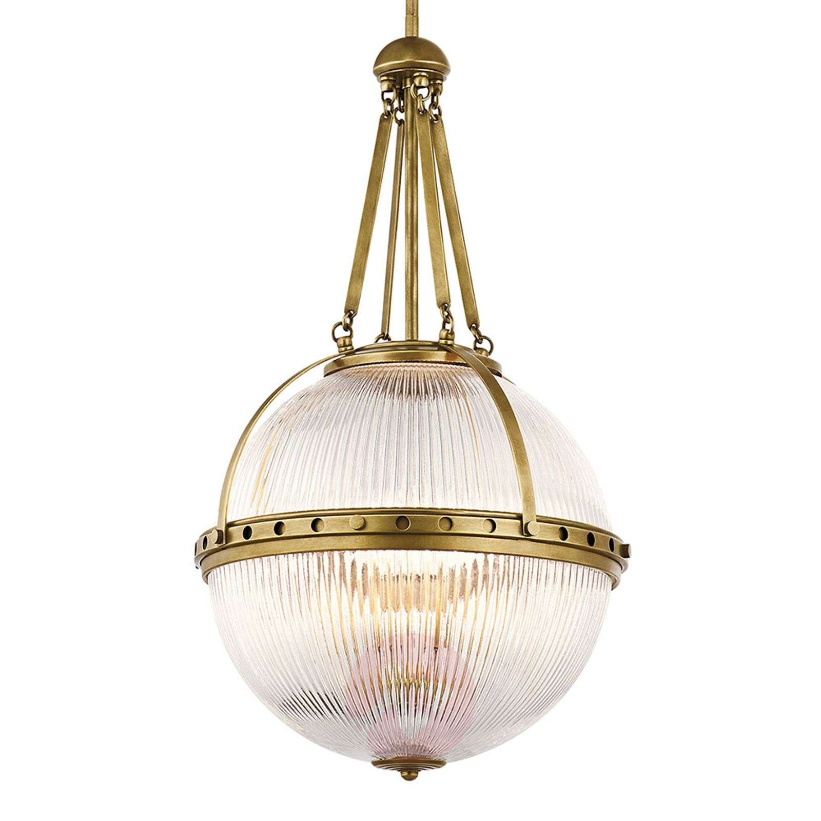 Okrągła lampa wisząca Aster z mosiądzu Okrągła szklana lampa wisząca Aster służy jako niezwykła lampa wisząca w ramach niepowtarzalnych aranżacji pomieszczeń. Zapewnia też indywidualny charakter wystroju. Stylowa elegancja łączy sie tu z rustykalnie wyglądającym elementem z mosiądzu. Dzięki sprytnemu połączeniu elementów mosiężnych o ciepłej barwie lampa pasuje zarówno do klasycznego wyposażenia, jak i do nowoczesnych mebli. Lampa wisząca ma okrągły klosz wykonany z żebrowanego szkła. Duża kula jest podtrzymywana przez mosiężny pierścień i filigranowy pręt prowadzący do sufitu. Niezwykły design zachwyca prostymi kształtami i eleganckim połączeniem mosiądzu i szkła. Okrągły kształt klosza dosłownie dopełnia styl lampy i sprawia, że przyciąga ona wzrok, gdy znajduje się na suficie. Klasa efektywności energetycznej: A++