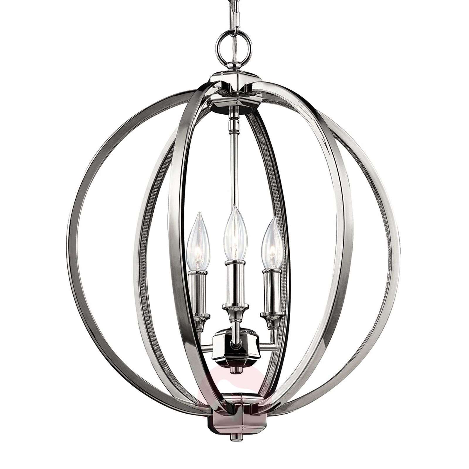 Kulista lampa wisząca Corinna z niklu polerowanego Okrągła lampa wisząca Corinne z polerowanego niklu przydaje salonowi nieco romantycznej elegancji. Podczas gdy zewnętrzna metalowa klatka nadaje lampie wiszącej Corinne nowoczesny wygląd, elementy oświetlenia w kształcie świec, znajdujące się wewnątrz lampy, są raczej zabawne. Metalowe łańcuszkowe zawieszenie lampy wiszącej nadaje jej szczególny urok. Otwarta konstrukcja lampy wiszącej sprawia, że świecące wewnątrz elementy świetlne nabierają własnego charakteru. Ta lampa, wisząc nad stołem w jadalni, wprowadza nieco życia do pomieszczenia, przyciągając w ten sposób wiele zachwyconych spojrzeń. Jednocześnie chłodne metalowe elementy lampy wiszącej są na tyle neutralne, że można je dopasować do różnych aranżacji wnętrz. Dlatego też pękata lampa wisząca Corinne jest szczególnie uniwersalnym dziełem sztuki. Klasa efektywności energetycznej: A++