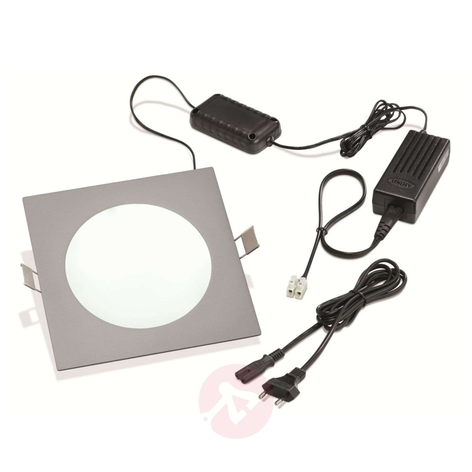 Kwadratowa oprawa wpuszczana Prince z 11 W LED Lampa zwraca uwagę niewielkim kształtem i równomierną emisją światła przy jego wysokiej mocy. Wewnątrz lampy, wokół niej, wpuszczono diody LED, które świecą z boku przez płytkę lampy. Zapewnia ona równomierne i nieoślepiające oświetlenie. Wersja z masywnego aluminium o niewielkiej głębokości wpuszczenia. Zestaw z transformatorem i elektronicznym sterownikiem. światło dzienne = 550 lumenów Wymiary transformatora (dł. x szer. x wys.): 105 x 45 x 30 mm Wymiary obudowy sterownika (dł x szer x wys): 90 x 50 x 30 mm Długość kabla transformator/sterownik: ok. 1,3 m (podłączony na stałe) Długość kabla sterownik/lampa: ok. 30 cm (podłączony na stałe) Klasa efektywności energetycznej: A+