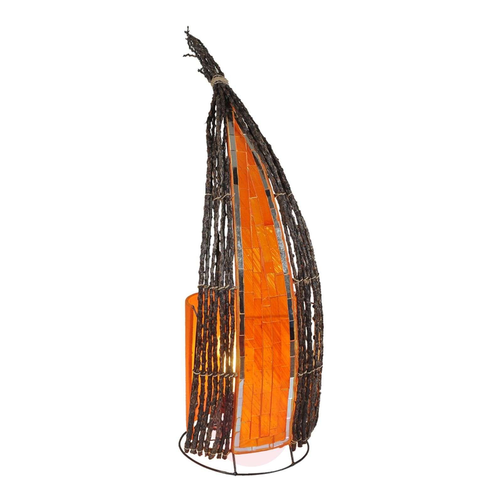 Lampa stołowa GRAYA - zabawa strukturą materiału Lampa stołowa GRAYA przyciąga uwagę różnorodnością zastosowanych materiałów i niezwykłą formą. Mozaika szklanych kamyków w soczystym odcieniu pomarańczowym połączona została z naturalnymi, brązowymi gałązkami. Strumień światła przenikający przez szkło mozaiki sączy się łagodnie, a wydostając się spomiędzy gałązek dociera już jaśniejszy na zewnątrz. Ta różnorodność tworzy ciekawe efekty świetlne. Lampa GRAYA dostępna jest też w wersji stojącej (wysokość 100 cm). Klasa efektywności energetycznej: A++