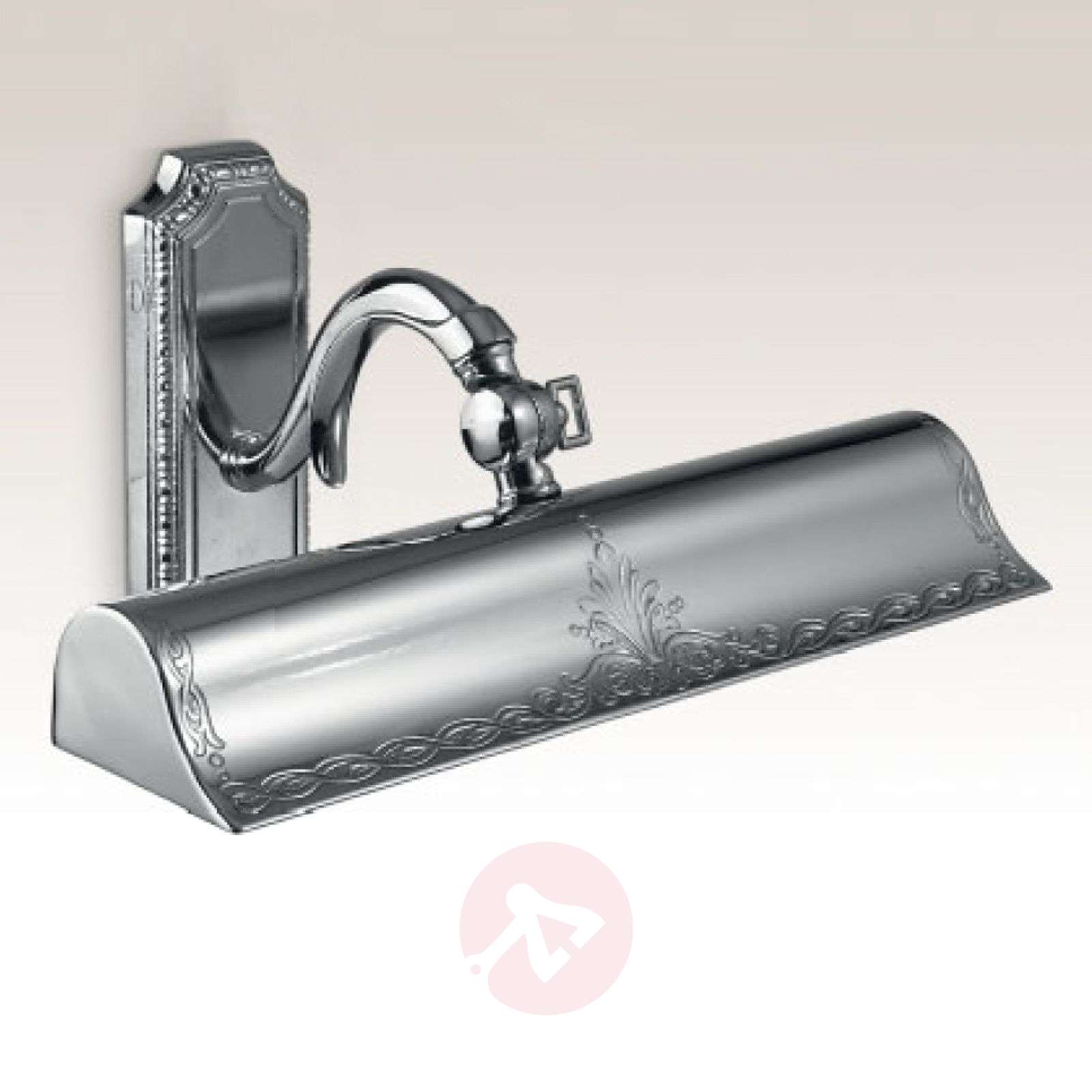 Klasyczne oświetlenie obrazów GALLERIA z nowoczesną, chromowaną powierzchnią Oświetlenie obrazów GALLERIA stanowi doskonałe połączenie klasycznych, eleganckich form z nowoczesnymi powierzchniami. Bogato dekorowane elementy wykonane z mosiądzu są zwieńczone w tej lampie mosiężnym kloszem, który można indywidualnie regulować. Lampa ścienna GALLERIA będzie prezentowała się wspaniale i stylowo zarówno w roli oświetlenia obrazów, jak i światła akcentowego. Klasa efektywności energetycznej: A++