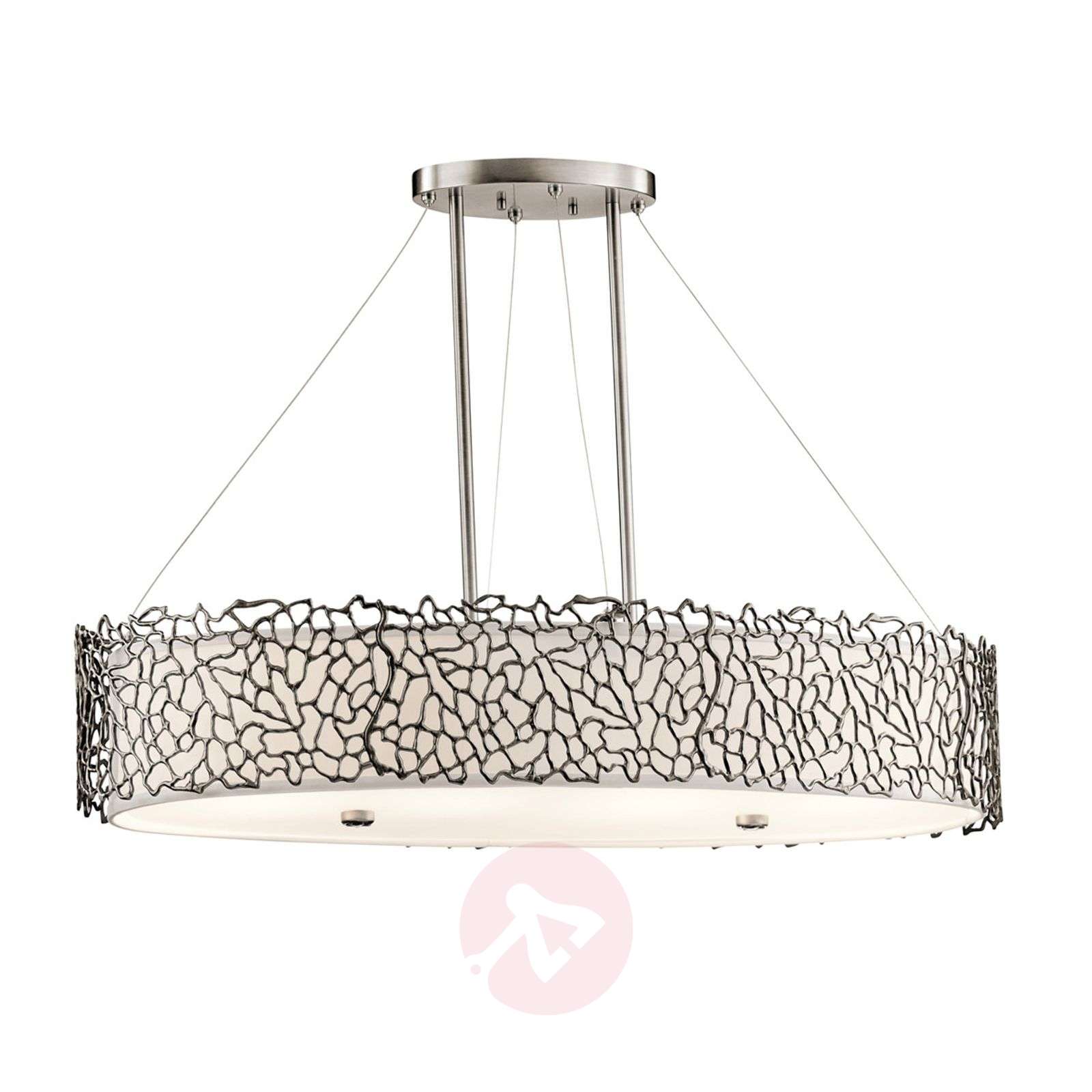 Owalna lampa wisząca Silver Coral do zapewniana oświetlenia dużych powierzchni Owalna lampa wisząca Silver Coral o długości 86,4 cm i szerokości 40,6 cm to naprawdę wymarzony obiekt oświetleniowy, rzucający się w oczy. Niezwykły kształt klosza, otoczony elementem o strukturze przypominającej kolonie koralowców, posiadającej wykończenie z cyny, przyciąga uwagę i tworzy atmosferę wręcz magiczną. Za pomocą Silver Coral można odpowiednio oświetlić na przykład większy stół w jadalni jadalny, nie rezygnując z przytulnej atmosfery. Ta lampa o doskonałych proporcjach wygląda bardzo ponadczasowo i pasuje do wnętrz urządzonych w najróżniejszych stylach. Klasa efektywności energetycznej: A++
