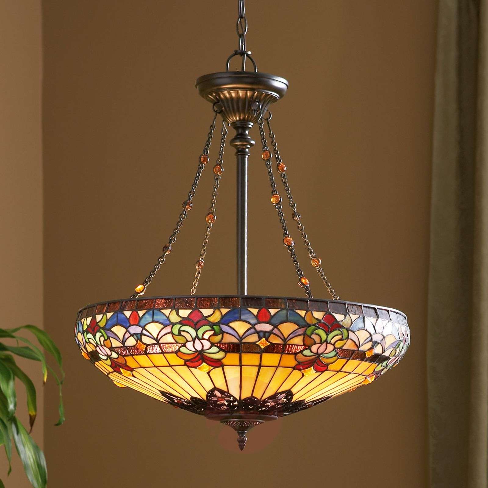 Belle Fleur – elegancka lampa wisząca o designie Tiffany Ta cudownie wykonana lampa wisząca o niezwykle bogatym w detale szklanym kloszu ozdabia każde wnętrze swym nieporównywalnym urokiem i z pewnością przyciągnie wiele spojrzeń pełnych podziwu. Lampa, która nawet przy wyłączonym świetle stanowi ładną dekorację, ukazuje pełnię swego uroku wtedy, gdy owo światło załączymy. W centrum jest tu klosz, na który składa się 605 pojedynczych szklanych kawałków. Łańcuszki, stanowiące część zawieszenia, są równomiernie rozmieszczone i przyczepione do delikatnych szklanych perełek, co czyni całość jeszcze bardziej dekoracyjną. Klasa efektywności energetycznej: A++