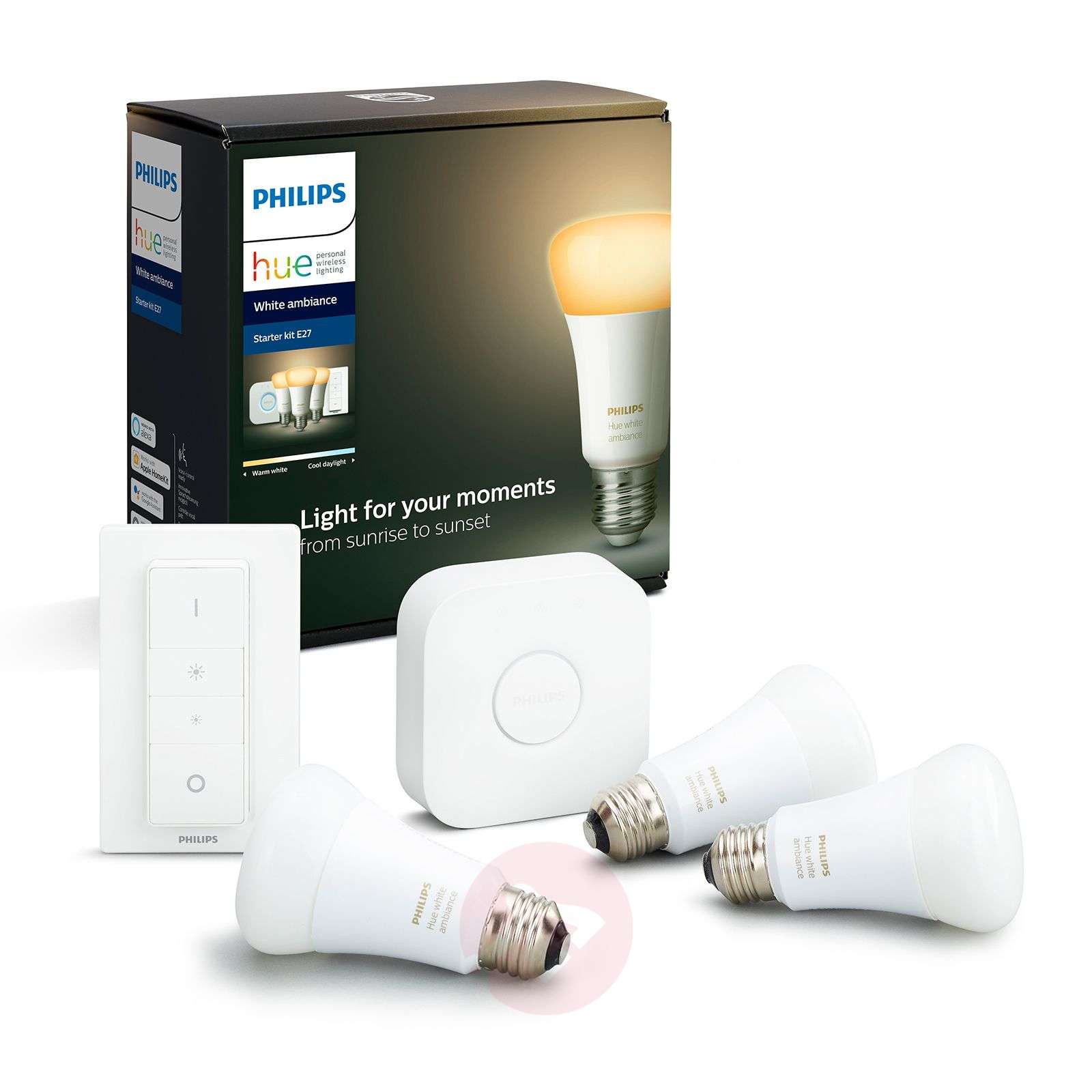 Elastyczne sterowanie światłem o każdej porze dnia - zestaw startowy Philips Hue White Ambiance E27 Zestaw ten zawiera wszystkie elementy niezbędne do skonfigurowania inteligentnego oświetlenia Hue. Trzy lampy zapewniają białe światło dla każdego otoczenia - jasne lub ściemnione, ciepłe i relaksujące lub chłodne i stymulujące koncentrację. Dołączony do zestawu bridge, który jest podłączony do routera, służy jako centrala sterująca systemu Hue. Umożliwia integrację, konfigurację, ustawianie rutyn i tworzenie scen za pośrednictwem aplikacji Hue; ta ostatnia może być połączona z Google Home, Amazon Alexa i Apple HomeKit, aby można było skonfigurować sterowanie głosowe, a także umożliwia zdalne sterowanie w drodze. Bezpośrednie sterowanie w tym samym pomieszczeniu za pomocą aplikacji Hue Bluetooth na tablecie lub smartfonie jest możliwe całkowicie bez integracji. Za pomocą załączonego ściemniacza, który może być również używany jako przełącznik ścienny dzięki uchwytowi, można ustawić jasność i barwę światła lub wybrać cztery sceny świetlne: Energize, Concentrate, Read i Relax. Po integracji Hue, specjalnie opracowane receptury oświetleniowe mogą być również przypisane do ściemniacza. Dane techniczne: - klasa efektywności energetycznej A+ - ustawienie barwy światła od ciepłej bieli (2 200 K) do światła dziennego (6 500 K) - zasięg Bluetooth wewnątrz ok. 10 m Cechy szczególne / kompatybilność: - sterowanie za pomocą dostarczonego ściemniacza Hue (włącznie z magnetycznym uchwytem ściennym - w zestawie samoprzylepna taśma montażowa) - sterowanie za pomocą pasującej aplikacją Hue (po podłączeniu przez mostek i router) i aplikacją Hue Bluetooth (bezpośrednio) dla systemu Android i iOS - kompatybilny z istniejącym systemem Philips Hue i innymi systemami opartymi na ZigBee, takimi jak Innogy, Bosch, Telekom (Magenta) i Busch-Jäger - możliwość sterowania głosowego za pośrednictwem Amazon Alexa, Apple HomeKit (Siri) i Google Assistant - ściemnianie za pomocą aplikacji, poleceń głosowych i ściemniacza - inteligentne sterowanie oświetleniem Opcja a: integracja ZigBee przez bridge i router, np. Philips Hue Bridge (patrz „Akcesoria dodatkowe”); umożliwia to sterowanie lokalne lub w drodze przez aplikację Hue (bezpłatne dla systemu Android i iOS) lub lokalnie przez polecenie głosowe przez Amazon Alexa, Apple HomeKit (Siri) i Google Assistant. - inteligentne sterowanie oświetleniem Opcja b: bezpośrednie sterowanie na miejscu poprzez Bluetooth przy użyciu bezpłatnej aplikacji Hue Bluetooth; wymaga to smartfonu lub tabletu wykorzystującego system Android 7 lub iOS 11 lub wyższy oraz technologię Bluetooth Low Energy (BLE) 4.0 lub wyższy. Połączenie z routerem, WLAN lub połączenie danych nie jest konieczne. W przypadku stosowania więcej, niż dziesięciu żarówek, zaleca się stosowanie bridge. Jedna żarówka może przechowywać połączenia z maksymalnie 15 smartfonami/tabletami; indywidualne ustawienia są przypisywane indywidualnie. Klasa efektywności energetycznej: A+
