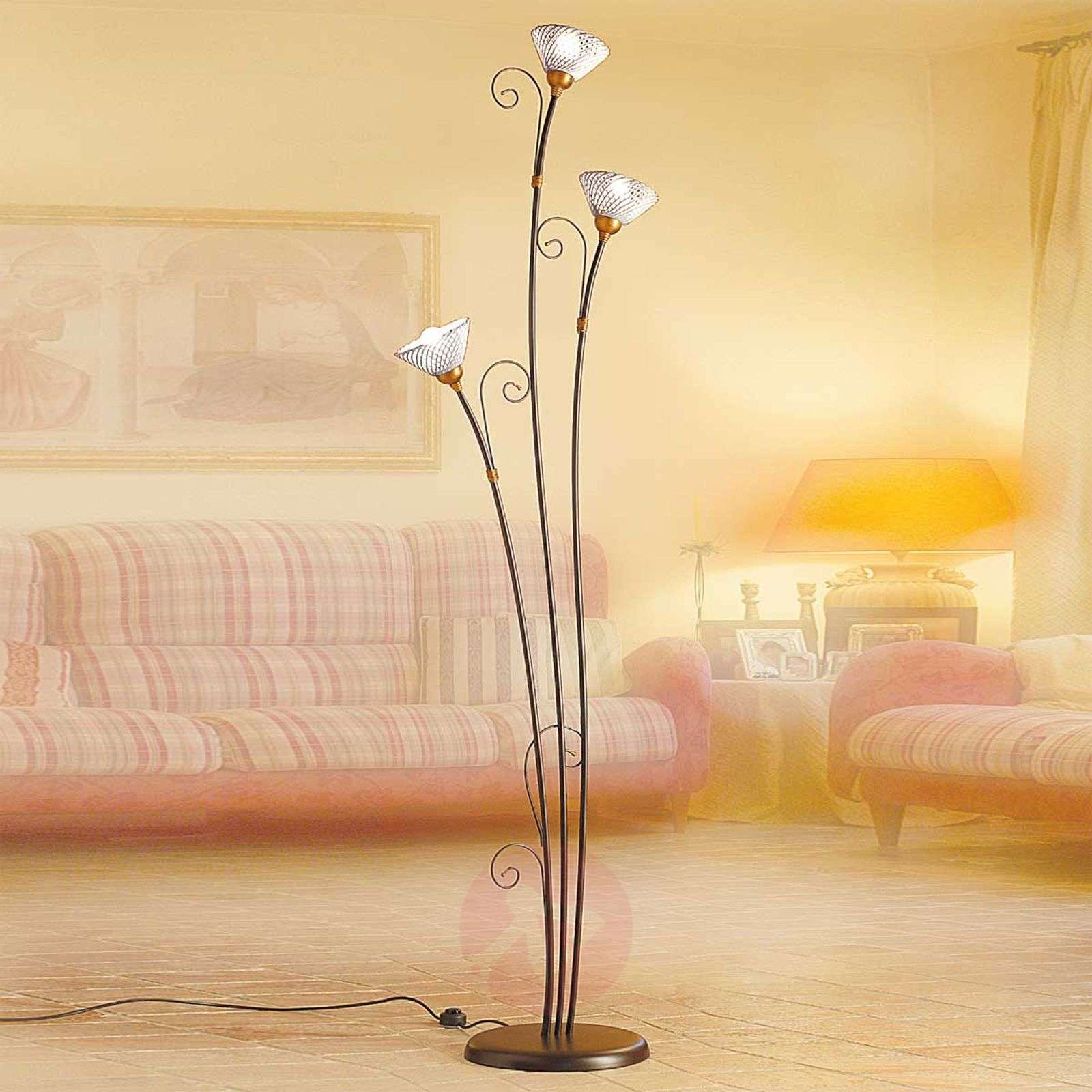 Piękna lampa stojąca RETINA z ceramicznymi kloszami ze wzorem siateczkowym Nastrojowy blask lampy stojącej RETINA wspaniale ozdobi i zaakcentuje wnętrza romantycznego dworku. Wzrok przyciągają jej białe, ceramiczne klosze uplecione na kształt koszyczka. Przez ich powierzchnię przenika odbijające się refleksami światło skierowane w dół i tworzy urokliwe efekty. Wykonana z metalu podstawa lampy jest niezwykle dekoracyjna, harmonizuje kolorystycznie i stylistycznie z całością. Klasa efektywności energetycznej: A++