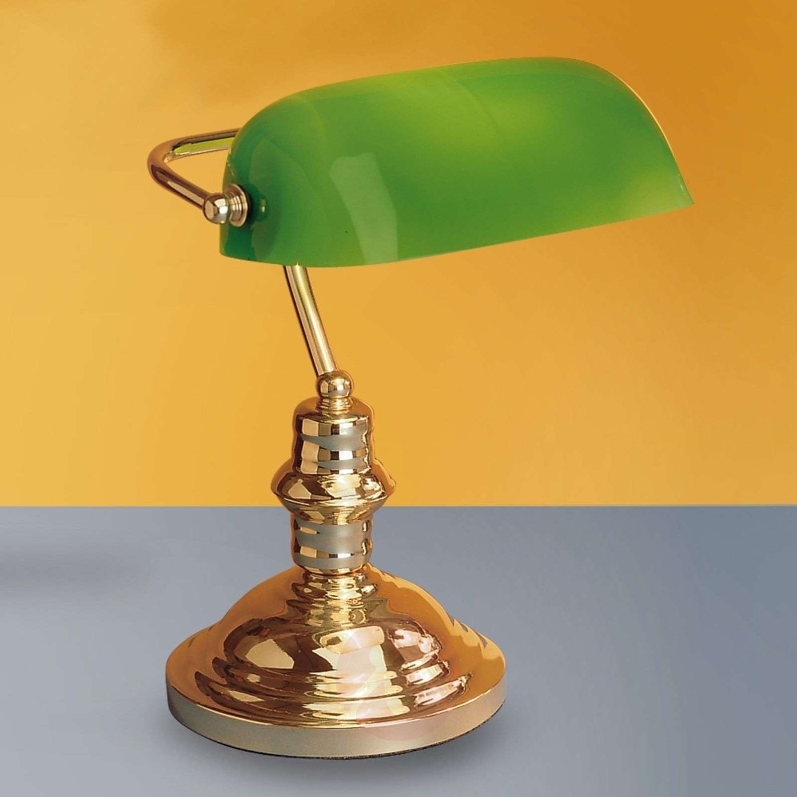 Stołowa lampa bankierska Onella z zielonym kloszem Atrakcyjna, bankierska lampa stołowa ONELLA będzie doskonale wyglądała w każdym pokoju i na każdym biurku. Umieszczony na podstawie w kolorze mosiądzu zielony klosz można nachylać pod wybranym kątem. Doskonałe połączenie atrakcyjnego wyglądu i skutecznego oświetlenia. Klasa efektywności energetycznej: A++