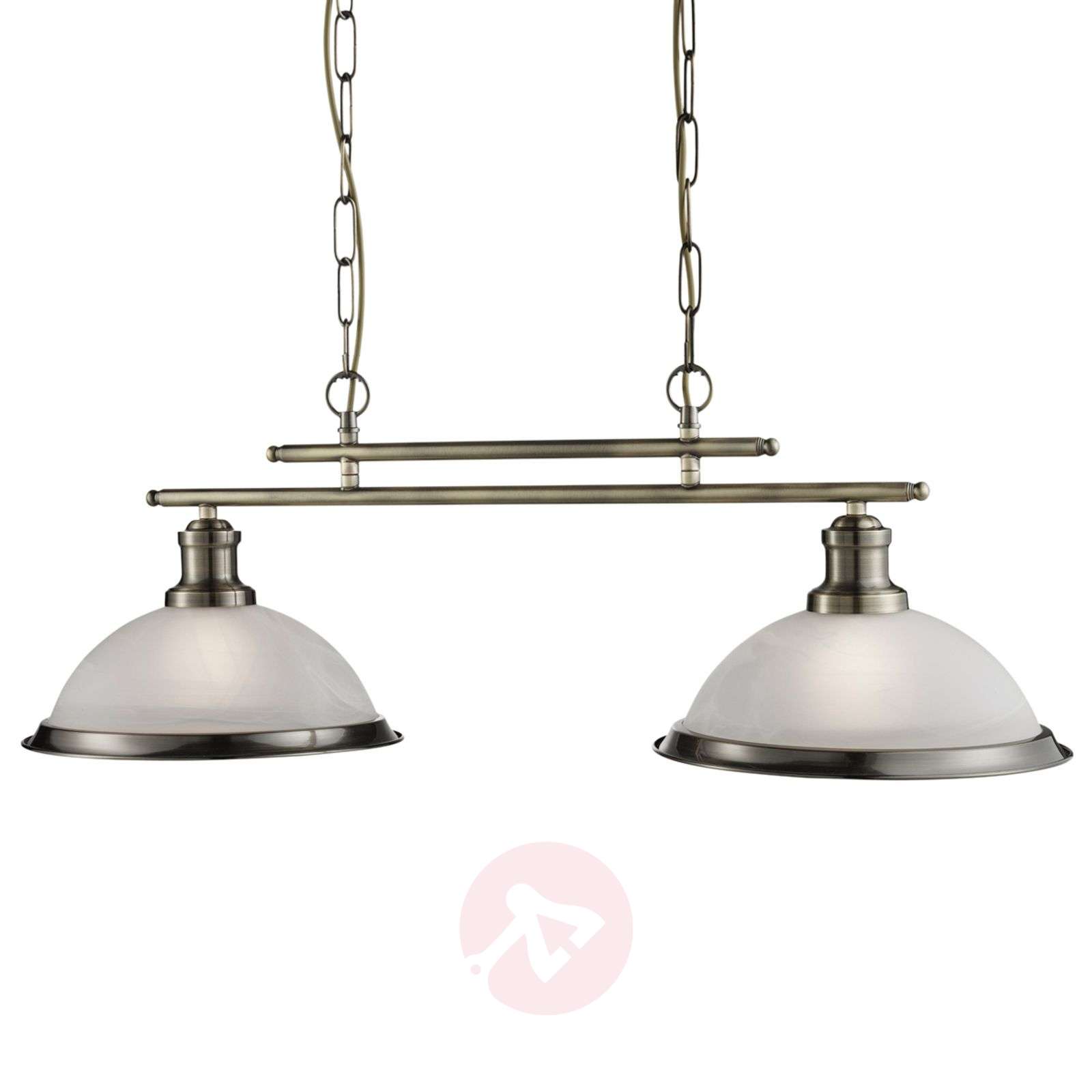 Lampa wisząca Bistro z dwoma szykownymi kloszami w antycznym stylu W tym projekcie w pierwszym rzędzie zwracają na siebie uwagę dwa klosze w antycznym stylu. Zamocowano je na dwóch długich, metalowych belkach o różnej długości, podtrzymywanych przez dwa zawieszenia łańcuchowe. Klosze mają mleczne wykończenie z drobnym, marmurkowym wzorem, a na krawędziach ozdobiono je panelami z takiego samego materiału, co rama. W kloszach znajdują się oprawki E27. Lampa zapewni odpowiednie światło w każdym pomieszczeniu. Ramę z metalu polakierowano na kolor starego mosiądzu. Wysokość lampy można zmienić stosownie do potrzeb. Ten model nadaje się doskonale i będzie pięknie wyglądał w jadalni, pokoju dziennym czy też kuchni. Klasa efektywności energetycznej: A++