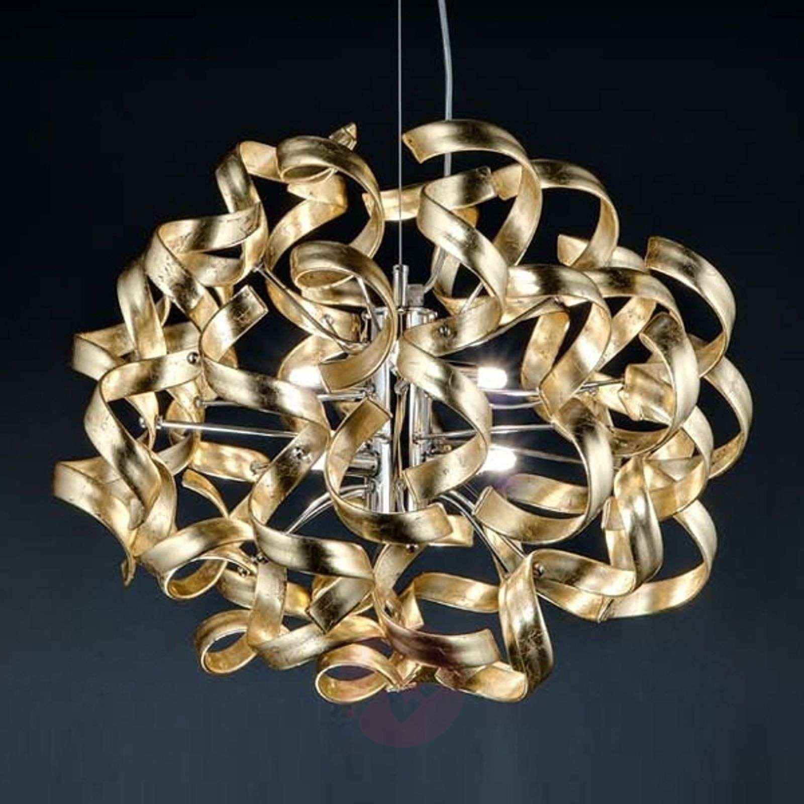 Lampa wisząca GOLD - idealna do luksusowego klimatu mieszkania Lampa wisząca GOLD składa się z umieszczonej na środku podłużnej metalowej podstawy w kolorze chromu. Od tej podstawy rozchodzą się we wszystkich kierunkach metalowe podpory. Do ich końców przymocowane są 24 powyginane, złciste metalowe elementy, które razem tworzą owalną lampę. Ze środka lampy wiszącej GOLD błyszczy sześć żarówek halogenowych, które odcieniowi złota nadają wyjątkowy blask. Dostawa nie obejmuje żarówek. Klasa efektywności energetycznej: A++