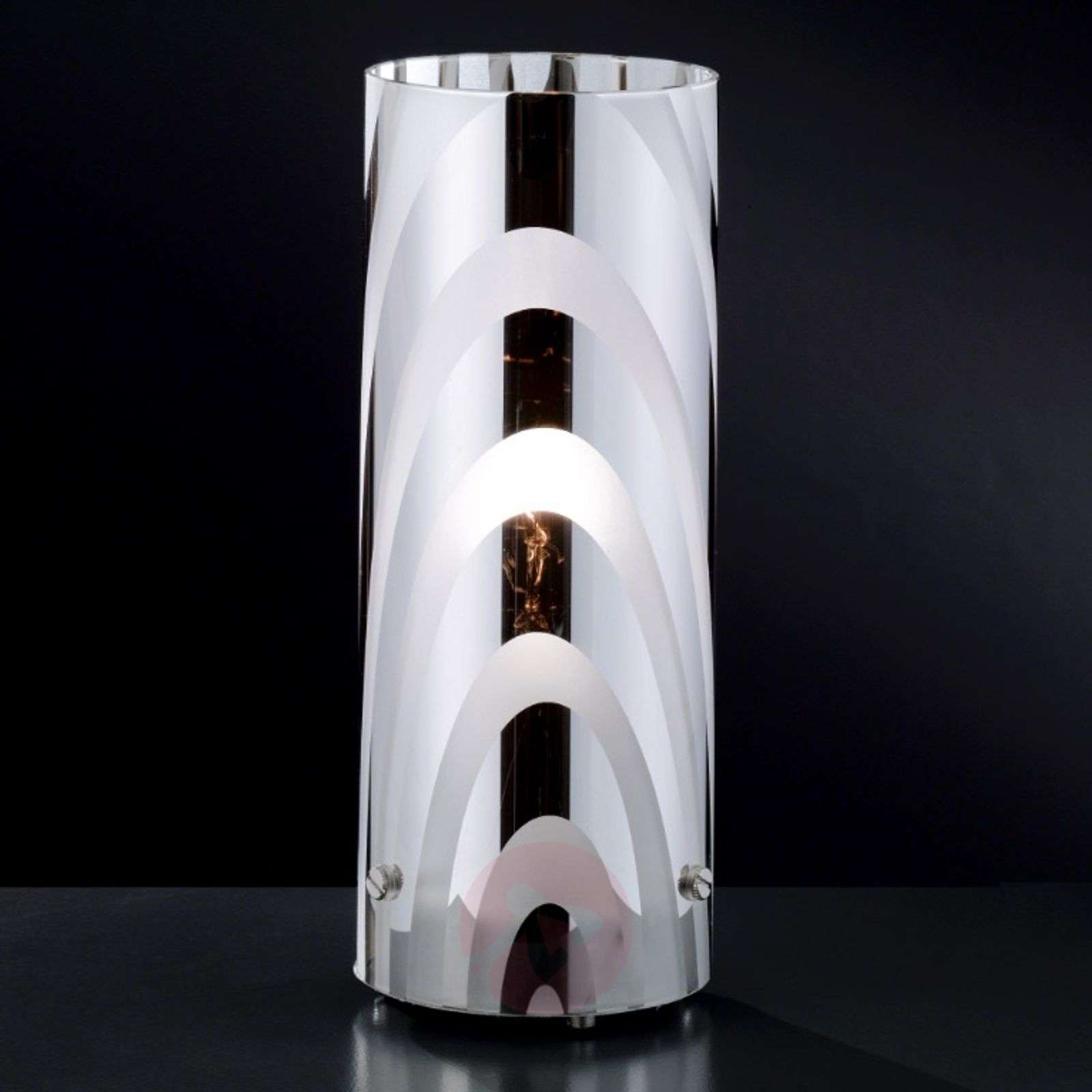 Wykonana ze szkła lampa stołowa COLLAGE zwraca uwagę nowoczesnym wyglądem Szczególnie ważnym elementem lampy stołowej COLLAGE jest szklany klosz, którego powierzchnia została pokryta falistymi dekoracjami, stanowiącymi urozmaicenie błyszczących chromowych i białych satynowanych elementów. Można sobie wyobrazić, że połączenie przezroczystości oraz przepuszczalności światła zapewnia wyjątkowe efekty świetlne. Klasa efektywności energetycznej: A++