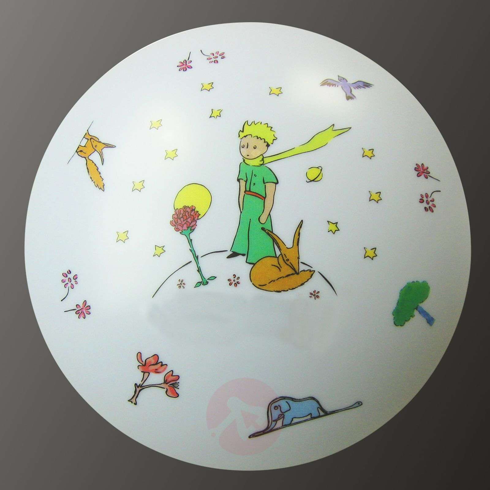 Okrągła lampa sufitowa Mały Książę z pięknym motywem Biały klosz z tworzywa sztucznego lampy sufitowej Mały Książę zdobią mały książę stojący pod niebem oraz liczne zwierzęta. Piękna lampa sufitowa, która zapewni oświetlenie ogólne w dziecięcym pokoju. Przystosowana do pracy tylko z energooszczędnymi żarówkami i żarówkami LED. Klasa efektywności energetycznej: A++