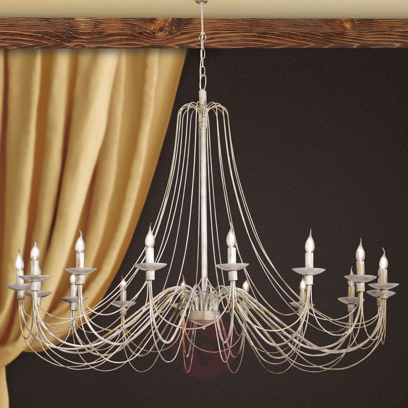 Klasyczny żyrandol ANTONINA w rustykalnym stylu - 16-pkt. Ten wspaniały metalowy żyrandol o rustykalnym designie wypełni wnętrze uroczystym światłem. Delikatny kolor kości słoniowej, w którym utrzymany jest metal, współgra z wieloma kompozycjami kolorystycznymi. Żyrandol podświetla 16 lampek w kształcie świec. Wymaganych jest 16 żarówek E14 o mocy 40 W. Najpiękniej wyglądać będą żarówki płomyki. Żarówki nie są zawarte w zestawie. Można je nabyć w dziale „Akcesoria”. Klasa efektywności energetycznej: A++